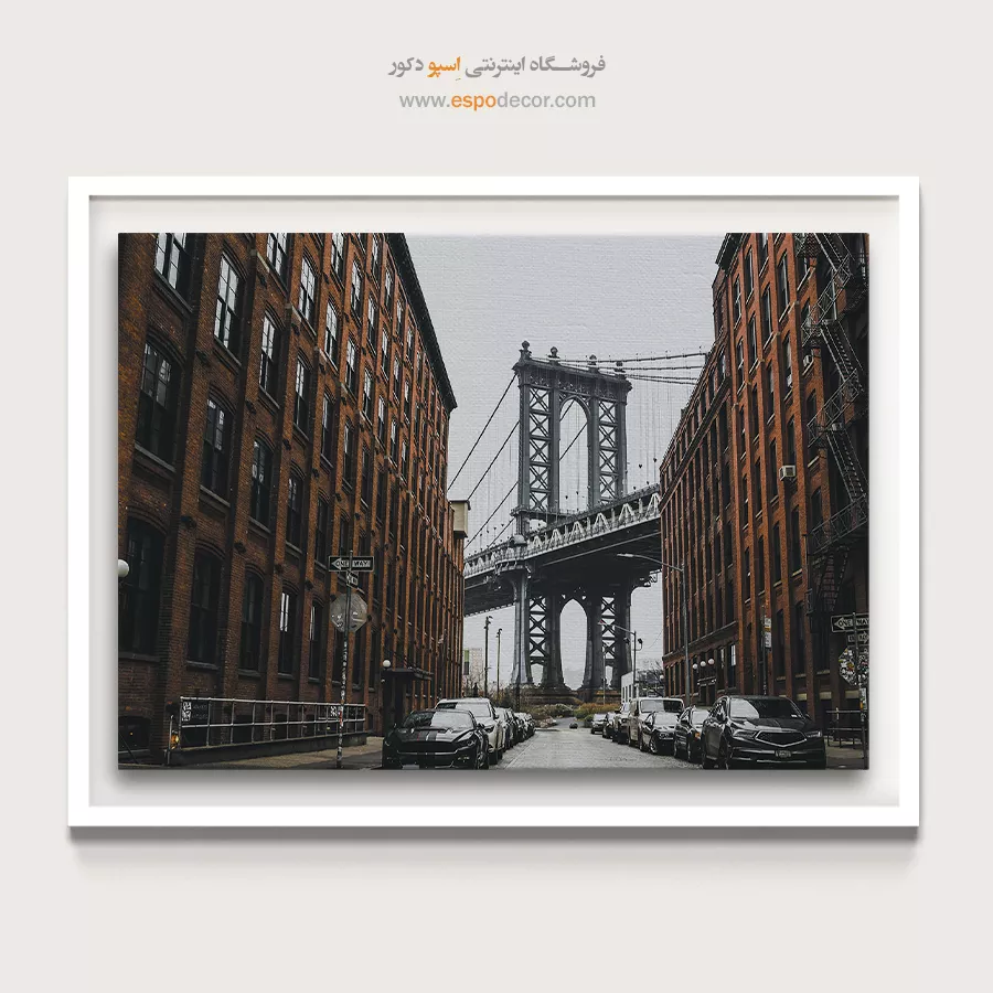 - تابلو شهر نیویورک مدرن: قاب مشکی، دیوار سفید و مبلمان مینیمال.