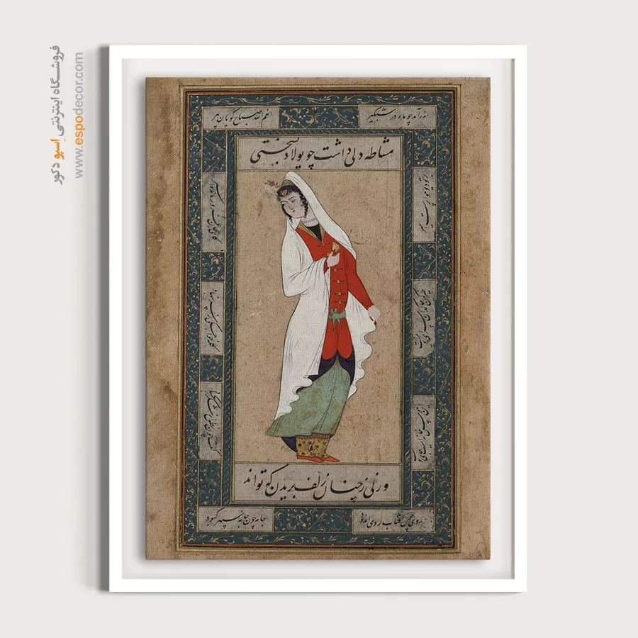 اگر عاشق جزئیات هستید، زیباترین تابلوهای نقاشی مینیاتور و نگارگری ایران برای شما ساخته شدهاند. این سبک پر از رنگهای زنده (لاجورد، شنگرف، طلا) است و پرسپکتیو در آن معنای متفاوتی دارد. مثلاً در تابلوی ملکه سبا، شما اوج ظرافت و داستانسرایی را میبینید. یا در اثر بانوی ایستاده با چادر سفید، سادگی و وقار زن ایرانی در قالب خطوط منحنی نرم به تصویر کشیده شده است.