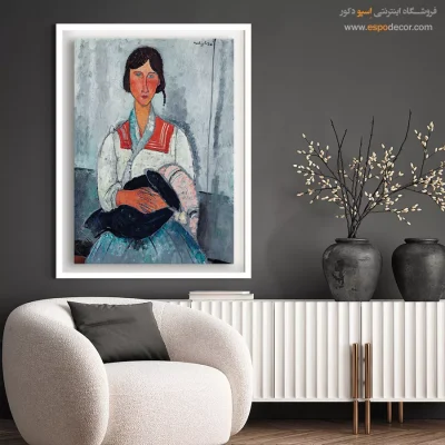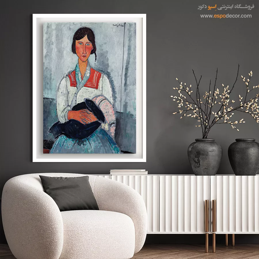 - استفاده از تابلویی با رنگ خنثی در پسزمینه: رنگهای سفید، خاکستری یا بژ، در حالی که رنگ اصلی دیوار یا رنگهای جزئی مبلمان و اکسسوریها در طرح آن تکرار شده باشد. این روش تعادل را در فضا تضمین کرده و از شلوغی بصری جلوگیری میکند.