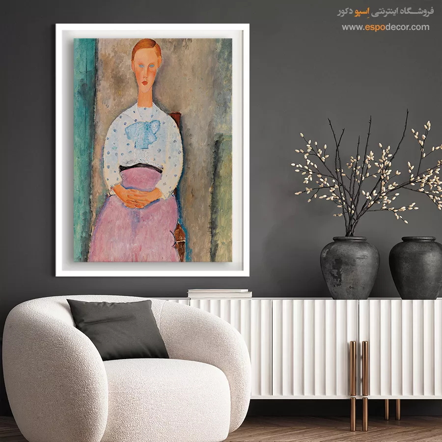 - استفاده از تابلویی با رنگ خنثی در پسزمینه: رنگهای سفید، خاکستری یا بژ، در حالی که رنگ اصلی دیوار یا رنگهای جزئی مبلمان و اکسسوریها در طرح آن تکرار شده باشد. این روش تعادل را در فضا تضمین کرده و از شلوغی بصری جلوگیری میکند.