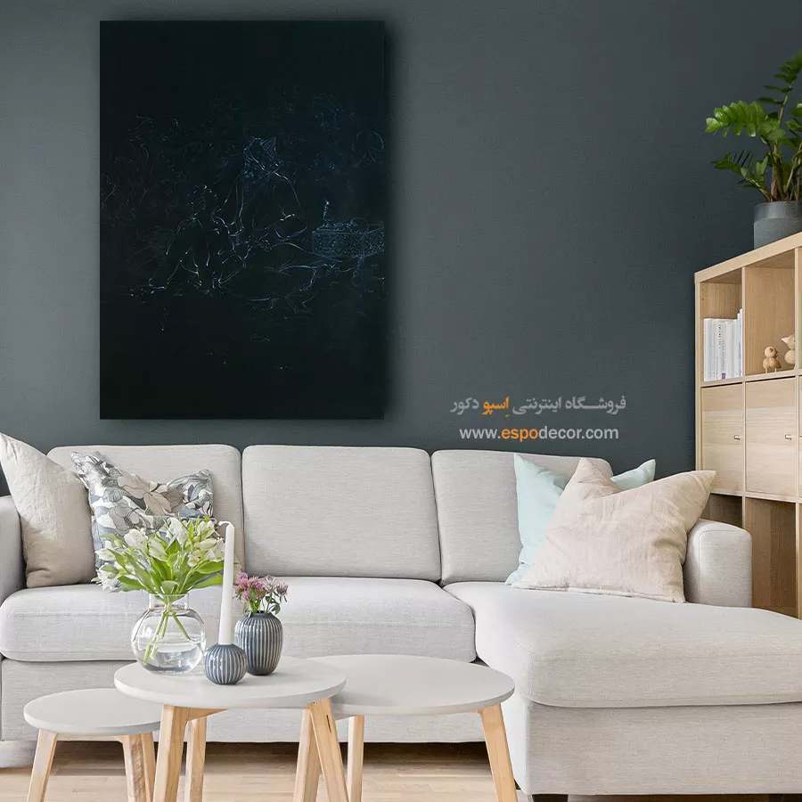 - انتخاب سایههای مختلف از رنگ دیوار: مانند تابلو آبی تیره روی دیوار آبی روشن، که حس آرامش و یکپارچگی در فضا ایجاد میکند.