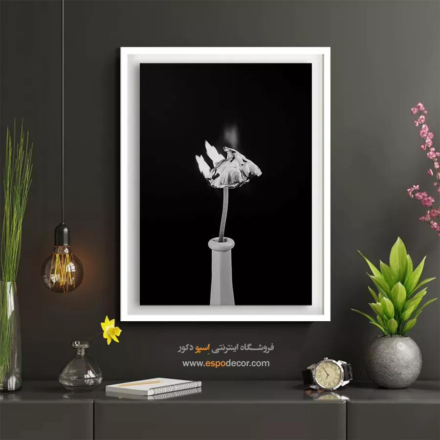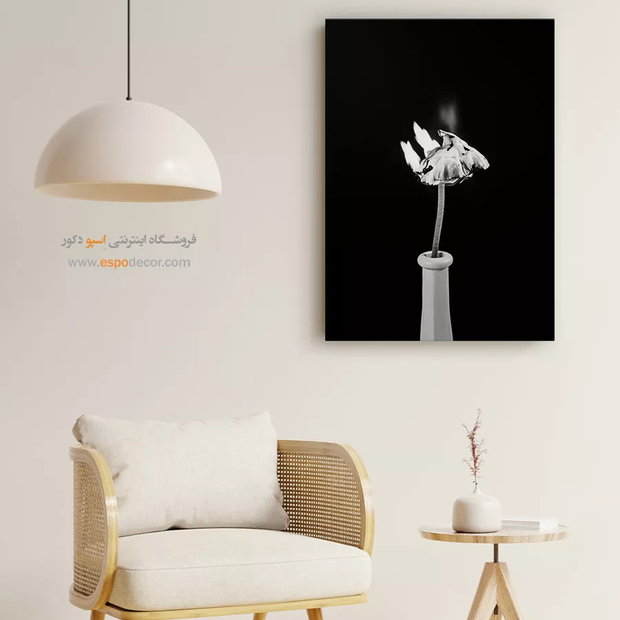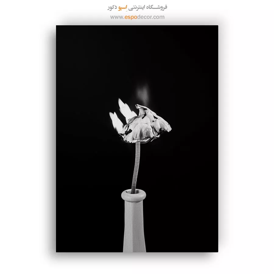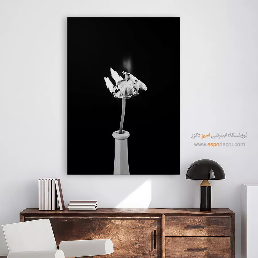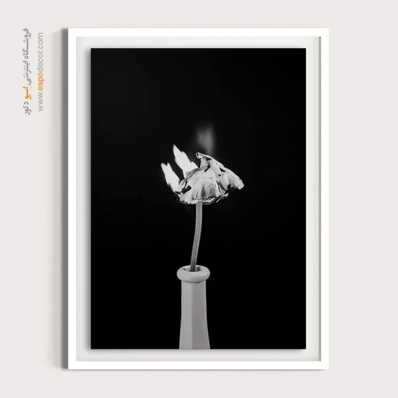 این تصویر یک اثر هنری سورئال و قدرتمند است که تضاد میان زیبایی فانی گل و نیروی مخرب آتش را در یک ترکیب مونوکروم به نمایش میگذارد. قرارگیری گل در گلدان و احاطه شدن در سیاهی مطلق، بر جلوه نمادین این صحنه تأکید کرده و حس درام و چرخه حیات و مرگ را القا میکند. این تابلو برای دکوراسیونهای مدرن، گالریهای هنری و فضاهایی با تم عمیق و مفهومی، یک نقطه کانونی منحصر به فرد ایجاد میکند.