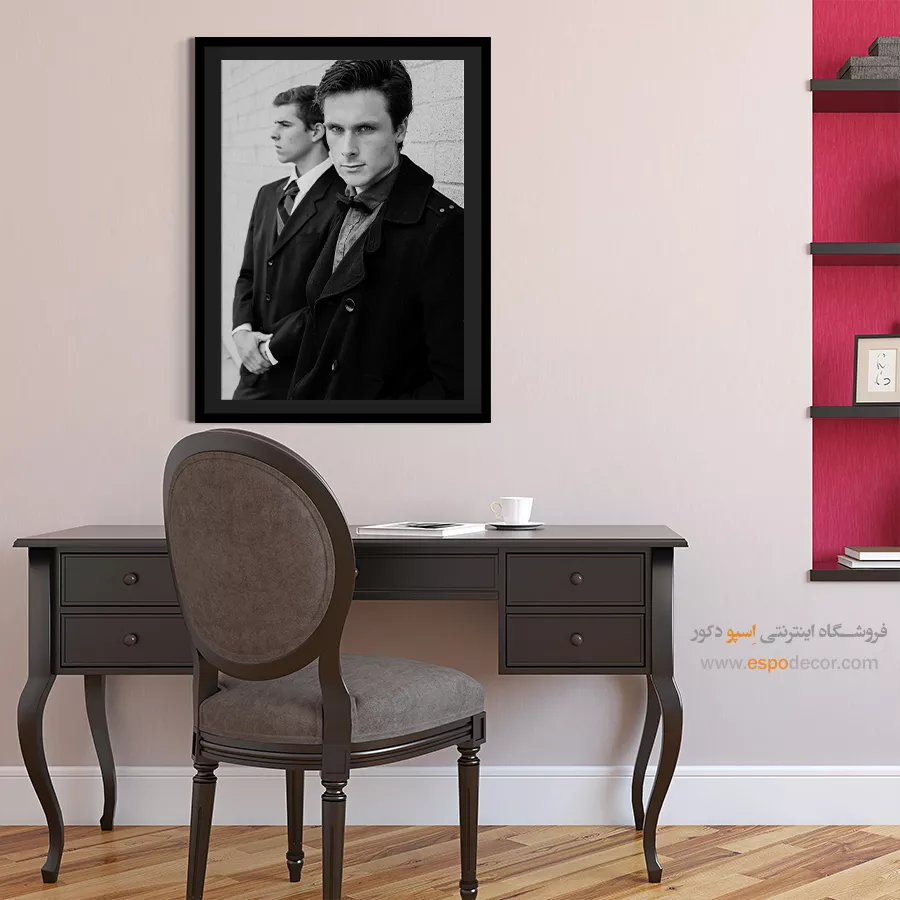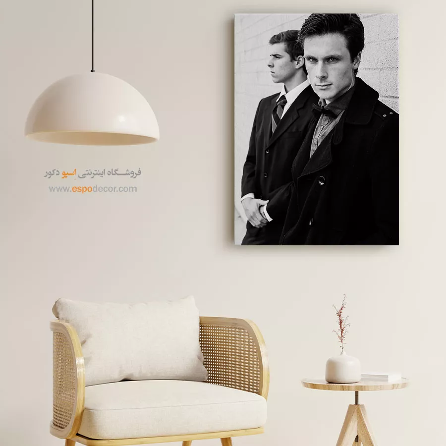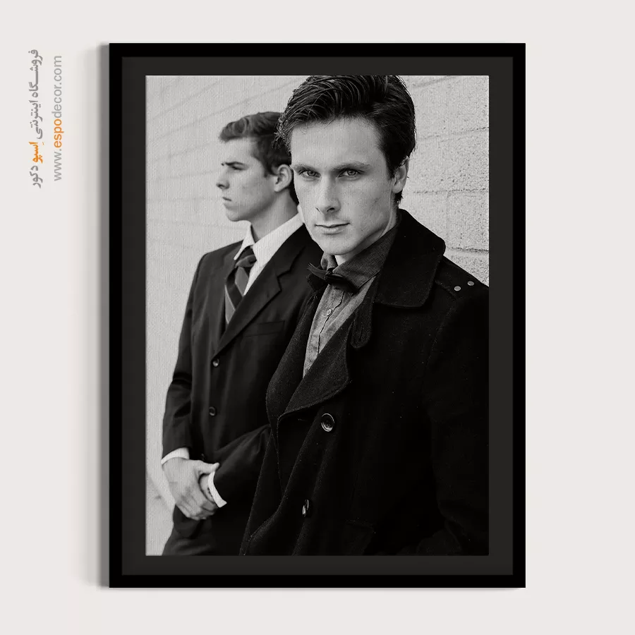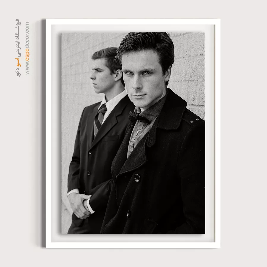 این عکس یک پرتره مد با کنتراست بالا است که دو مرد جوان با استایل رسمی، کت و پالتو، و ژستی متفکرانه را در برابر یک دیوار بافتدار به تصویر میکشد. فوکوس قوی بر چهره مرد جلویی و نگاه نافذ او، در تضاد با محو بودن مرد پشتی که به سویی دیگر نگاه میکند، حس رمزآلود و عمق به پرتره میدهد. این تابلو برای دکوراسیونهای لوکس، فضاهای تجاری، یا هر دکوراسیونی که به دنبال یک اثر با تم مردانه و باکلاس است، انتخابی بسیار مناسب میباشد.