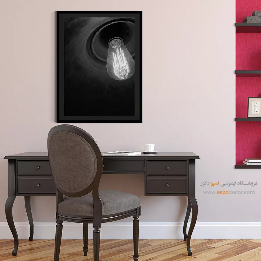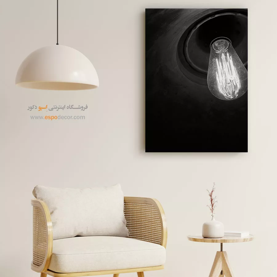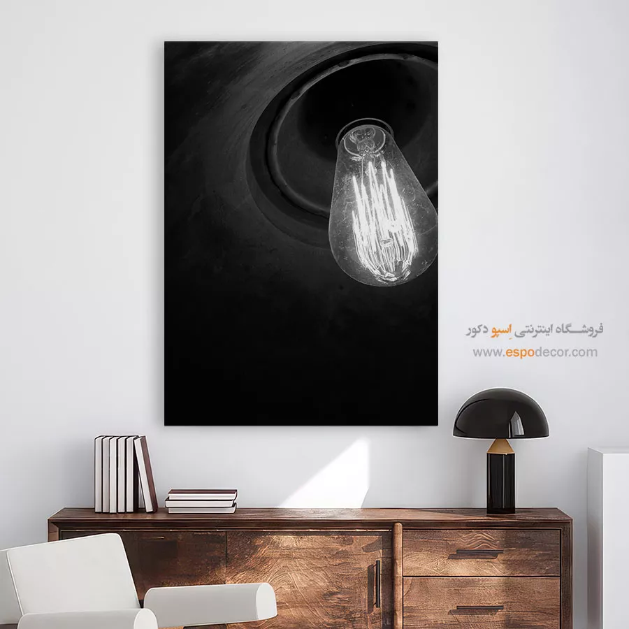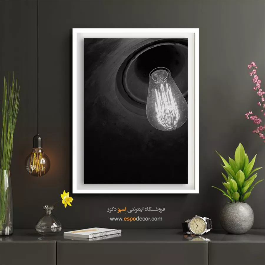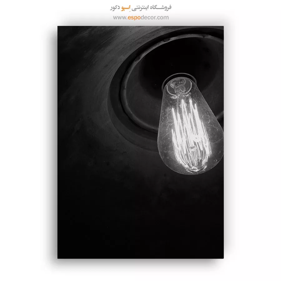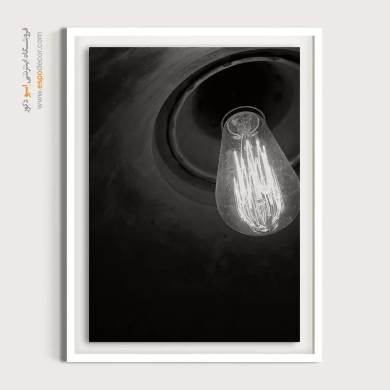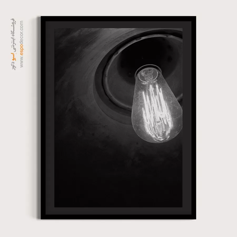 این تصویر یک نمای نزدیک و دراماتیک از یک لامپ ادیسون رشتهای و روشن است که بافت تیره و مخروطی محفظه، کنتراست و عمق بصری زیادی به آن بخشیده است. رشتههای پرنور لامپ در برابر سیاهی پسزمینه، یک جلوه روشن و قوی ایجاد کرده و حس نوستالژی، گرما و ظهور یک ایده را منتقل میکند. این اثر برای دکوراسیونهایی با سبک صنعتی (Industrial)، وینتیج (Vintage) و کافهها یا فضاهای کاری خلاقانه انتخابی جذاب است.