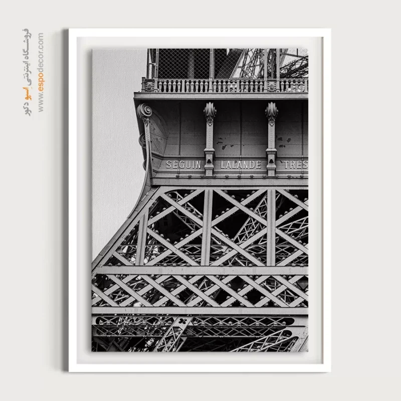 این تصویر یک نمای نزدیک و قدرتمند از معماری پایههای برج ایفل است که پیچیدگی بافت فلزی و الگوی مشبک سازه را با جزئیات بالا به نمایش میگذارد. کنتراست شدید بین فولاد تیره و آسمان روشن، جلوهای تاریخی، محکم و در عین حال ظریف به ساختار بخشیده است. این تابلو برای دکوراسیون فضاهای صنعتی، گالریهای معماری، و به عنوان یک یادآوری شیک از پاریس، انتخابی بسیار جذاب و چشمگیر است.