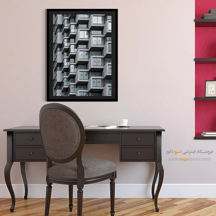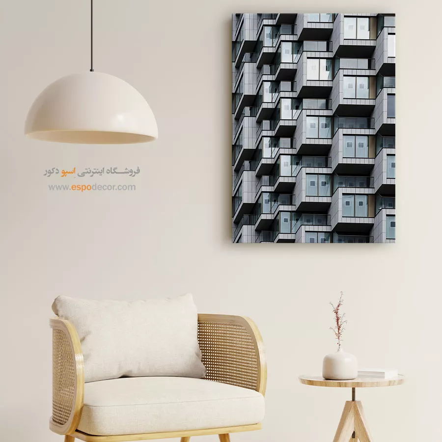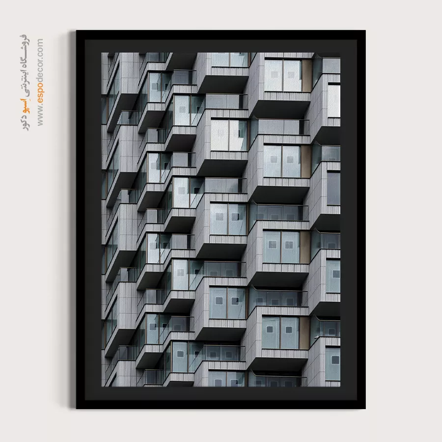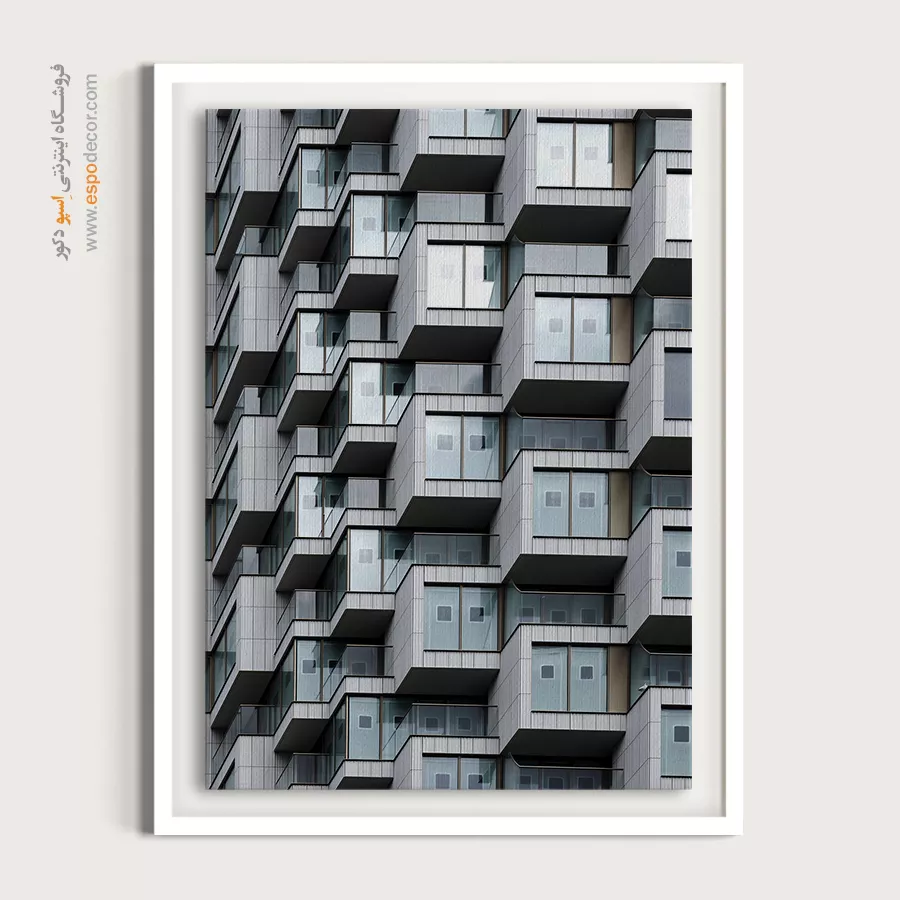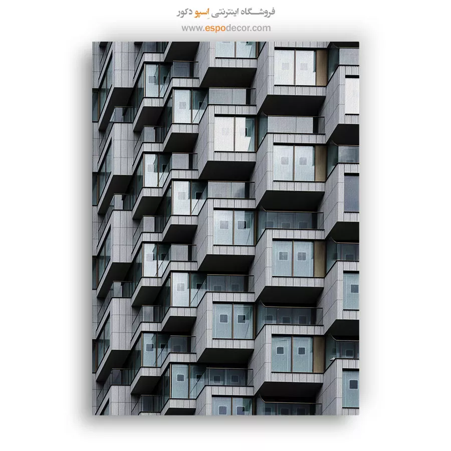 این تصویر نمایانگر الگوی سهبعدی و تکرارشونده بالکنها و پنجرههای یک ساختمان مدرن است که با ایجاد سایهروشنهای طبیعی، عمق بصری قوی ایجاد کرده است. بیرونزدگی منظم بالکنها، یک بافت پر جنب و جوش و شبیه به پازلهای هندسی به وجود آورده که حس نظم و پویایی در زندگی شهری را منتقل میکند. این اثر هنری برای دکوراسیونهای مدرن، فضاهای اداری و هر محیطی که به دنبال یک نمای شهری منظم و با جزئیات بالاست، انتخابی برجسته میباشد.