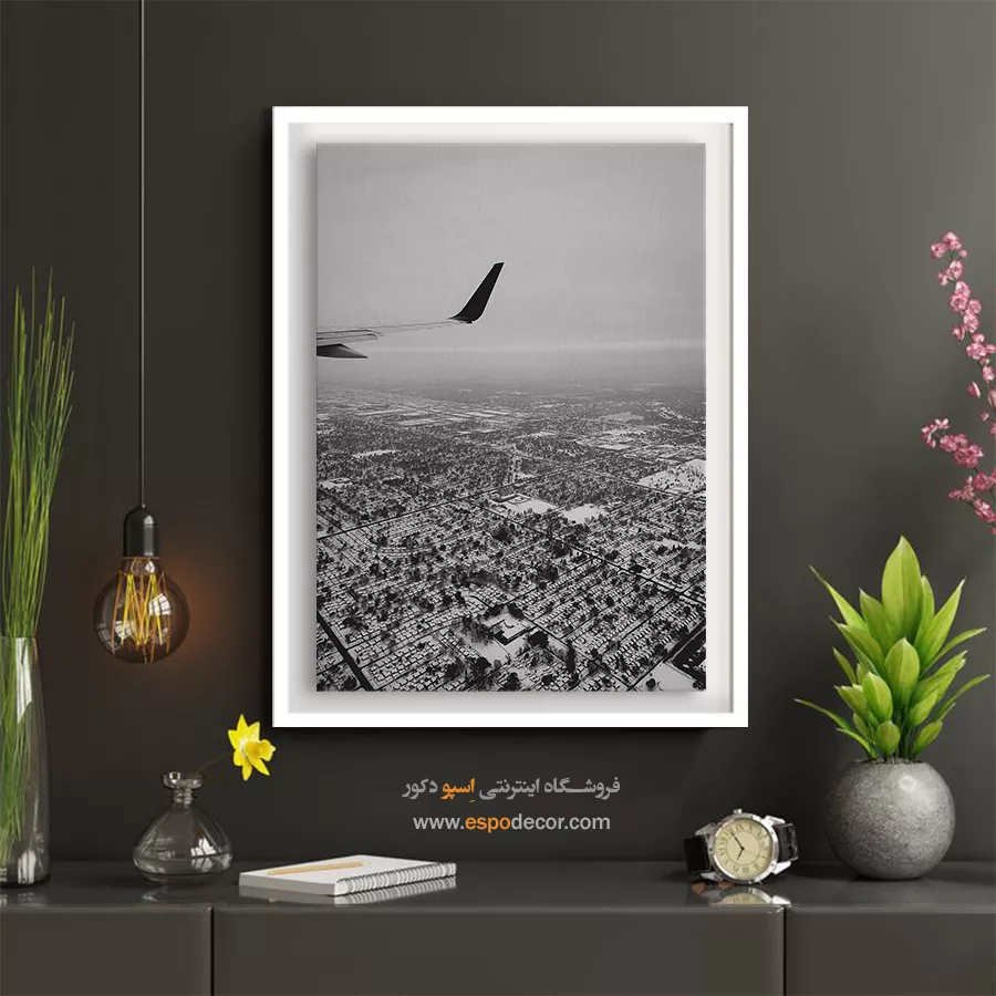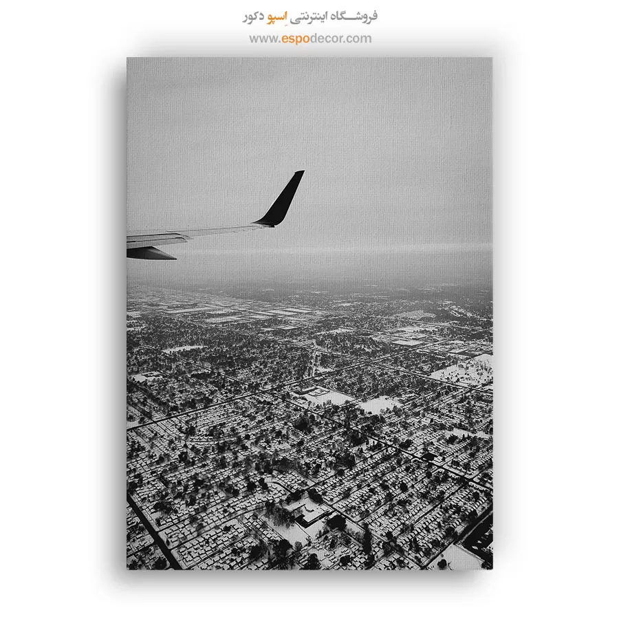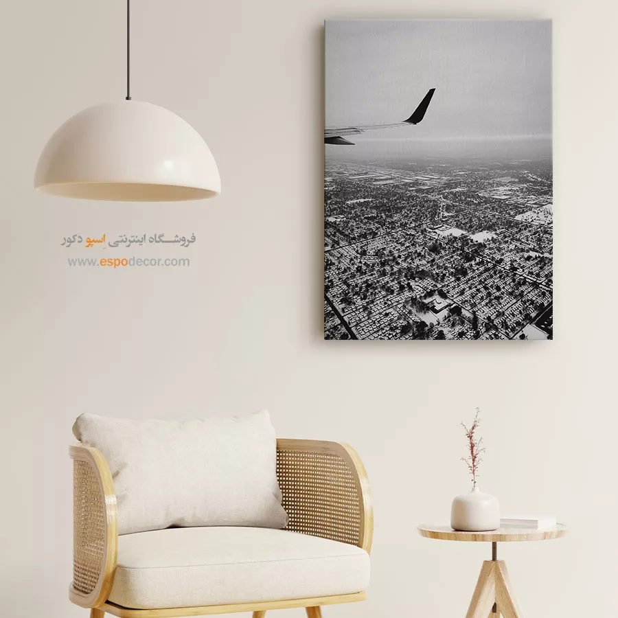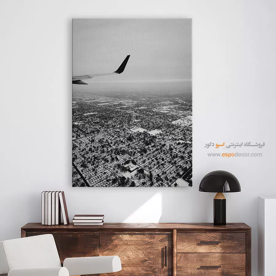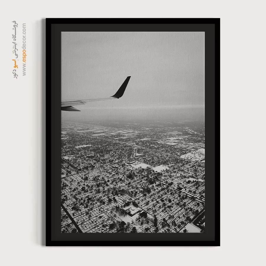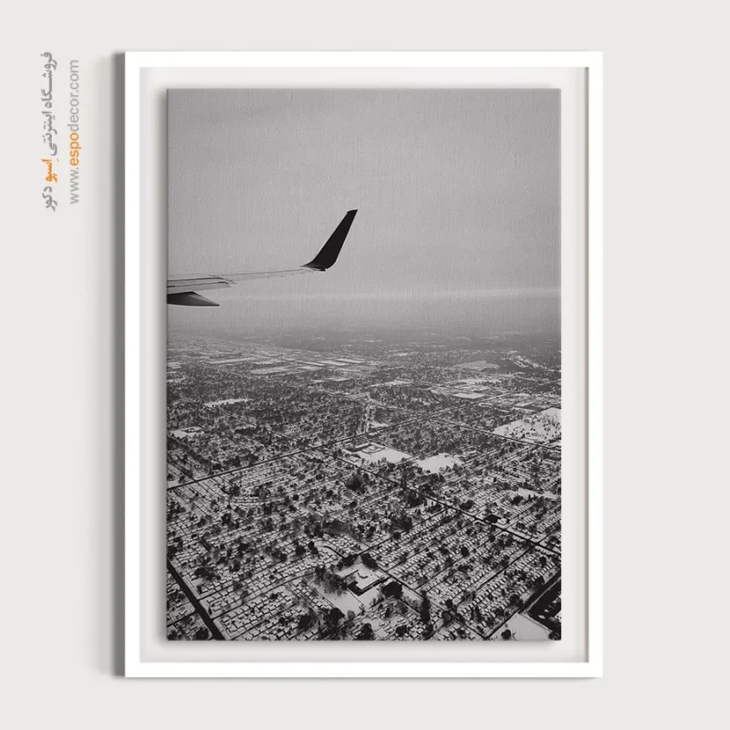نمای هوایی جذاب از یک محله مسکونی است که بافت مربعی و منظم خیابان‌ها و خانه‌ها، زیر پوششی از برف، حالتی هندسی و هنری به منظره بخشیده است. نوک بال هواپیما در بالای کادر، پرسپکتیو سفر و ارتفاع را تثبیت کرده و حسی از عظمت و نظم در مقیاس وسیع را منتقل می‌کند. این اثر با تم بصری روشن و منظم، انتخابی ایده‌آل برای فضاهای اداری، اتاق‌های نشیمن مدرن و هر محیطی که به دنبال ترکیبی از نظم و طبیعت است، می‌باشد.
