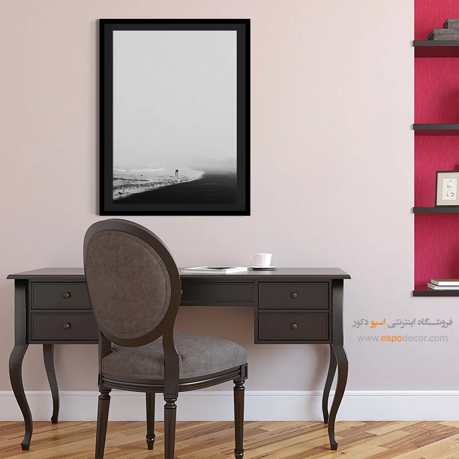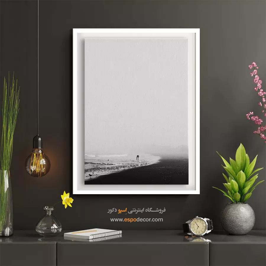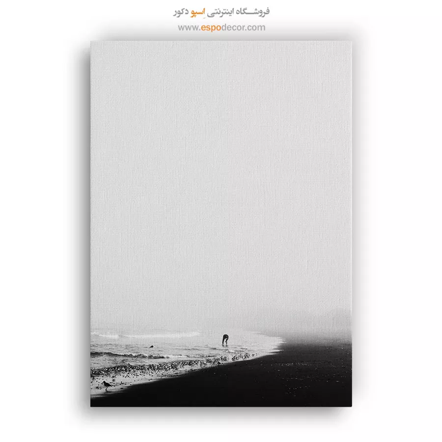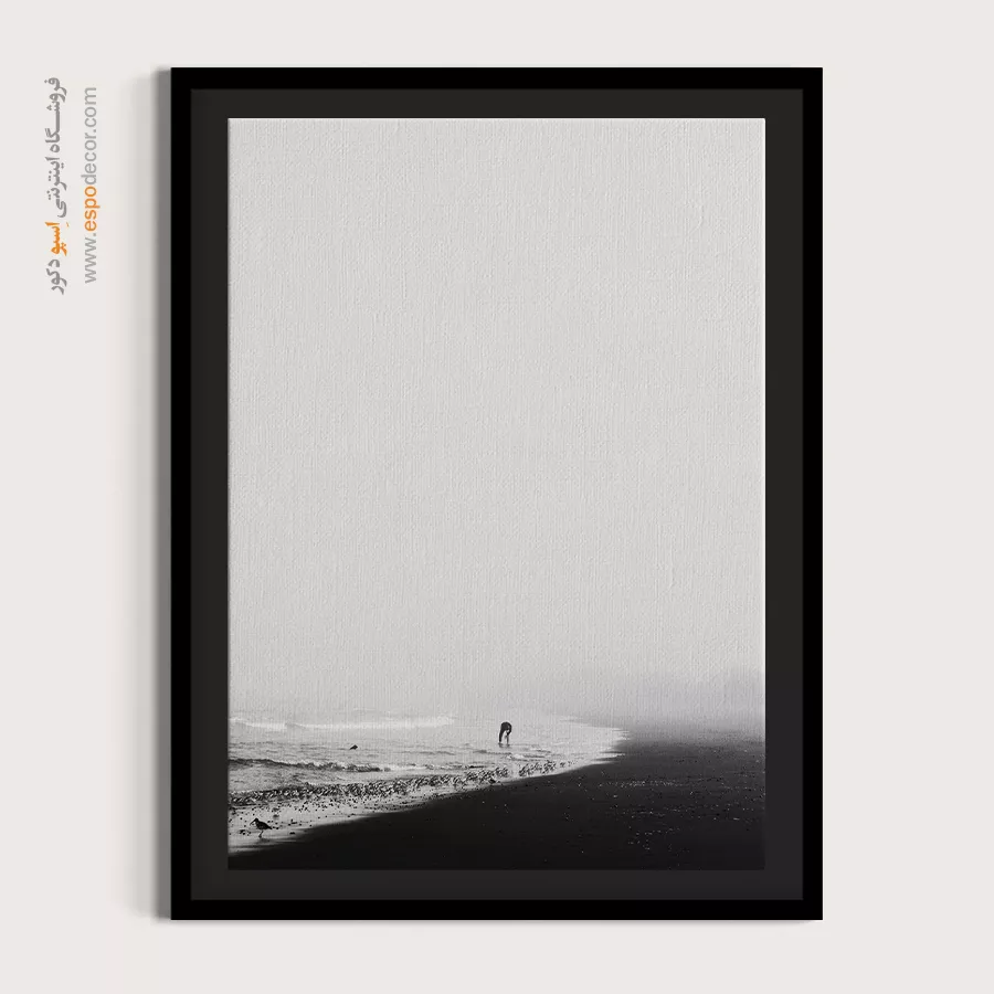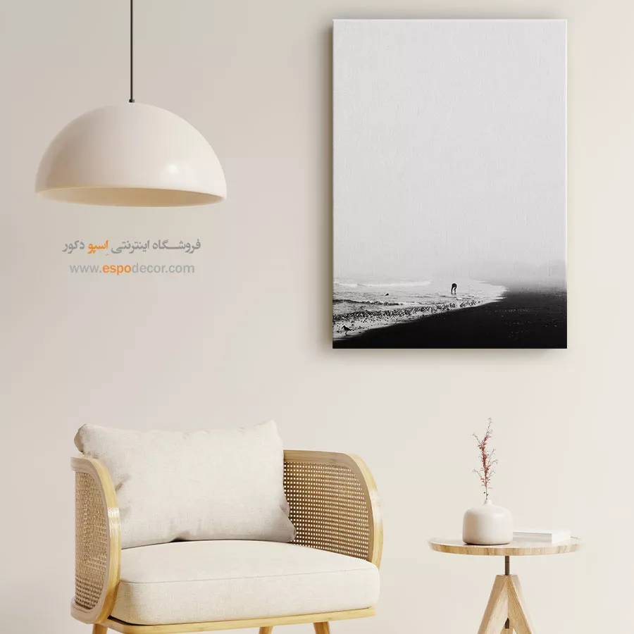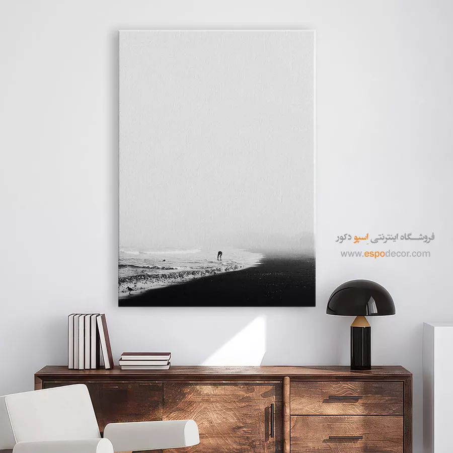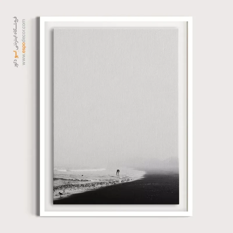 یک منظره مینیمال و آرامشبخش از ساحلی شنی است که با فضای خالی و روشن، حس مه، سکوت مطلق و تنهایی را به شکلی برجسته القا میکند. خط ساحلی تیره و مواج، در تضاد با روشنایی آسمان و فیگور کوچک انسانی در پایین، پرسپکتیو و درام خاصی ایجاد کرده و بیننده را به تأمل دعوت میکند. این اثر هنری برای دکوراسیونهای مدرن، مینیمال، لابیها و فضاهایی که به دنبال یک نقطه کانونی آرام و عمیق هستند، انتخابی ایدهآل میباشد.