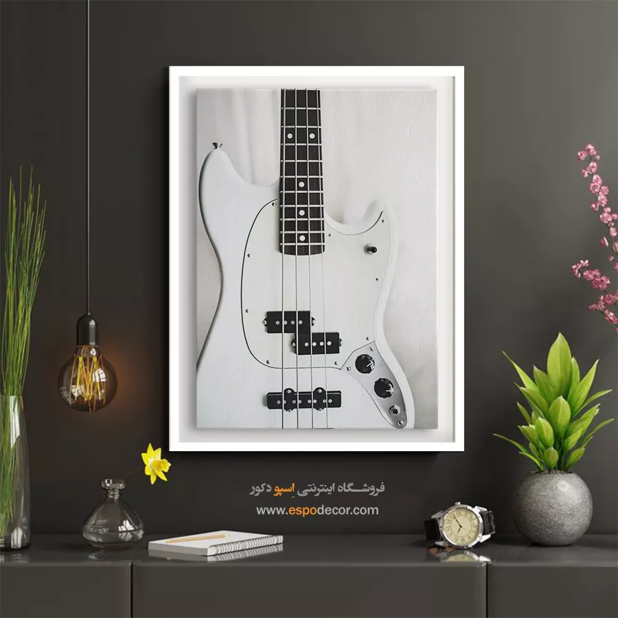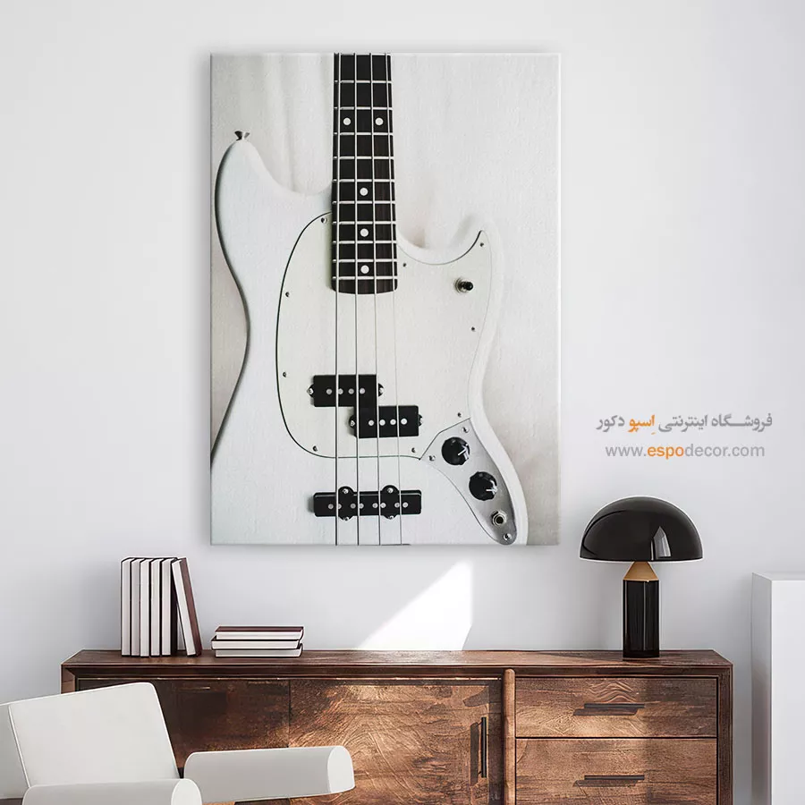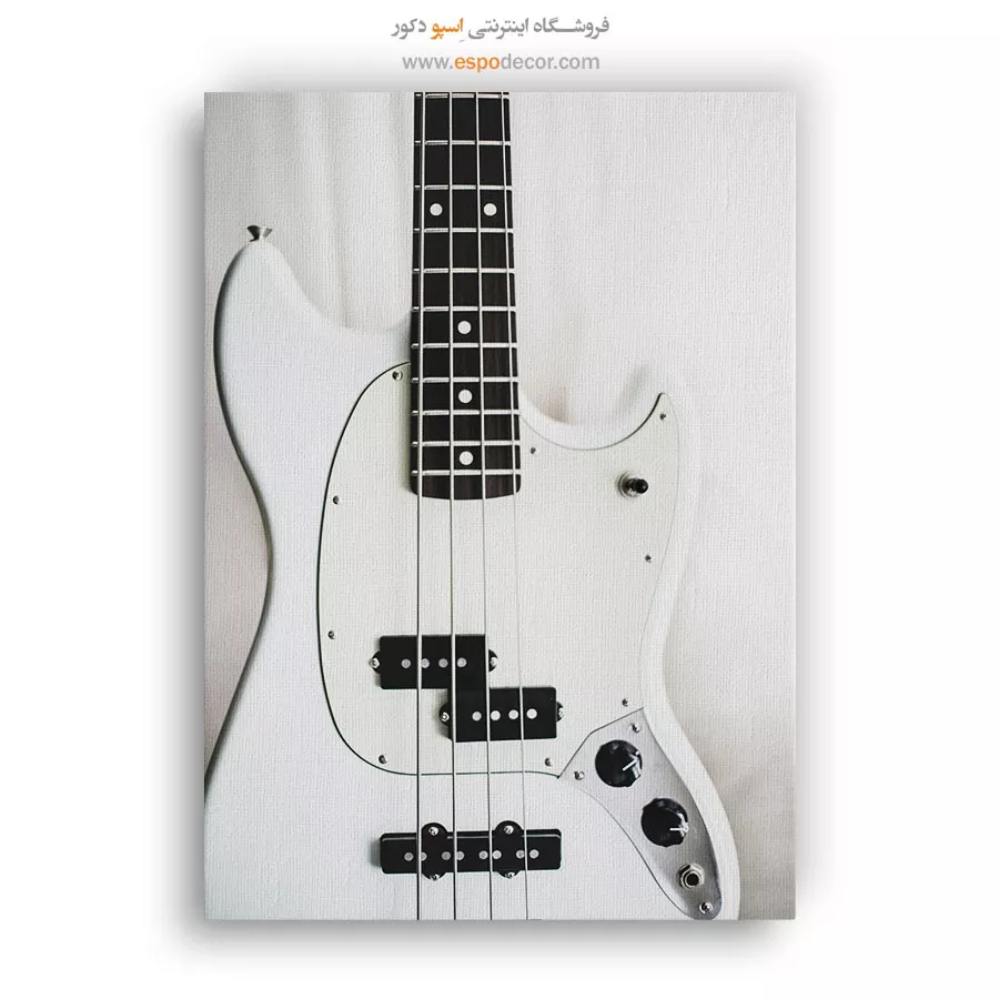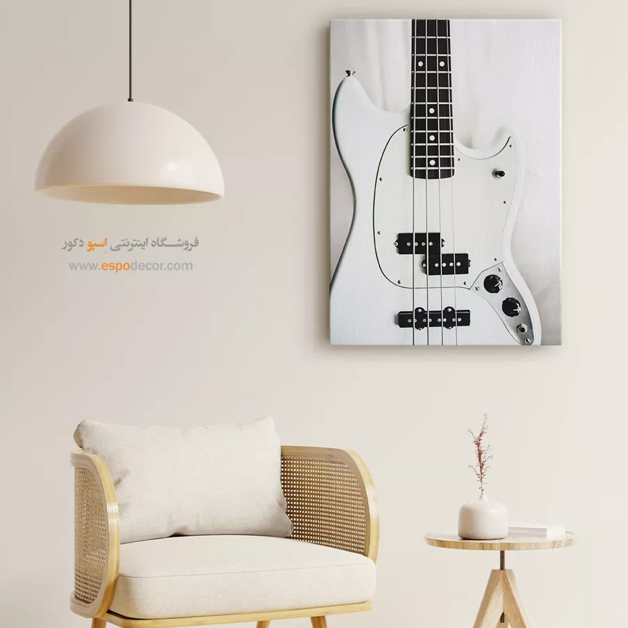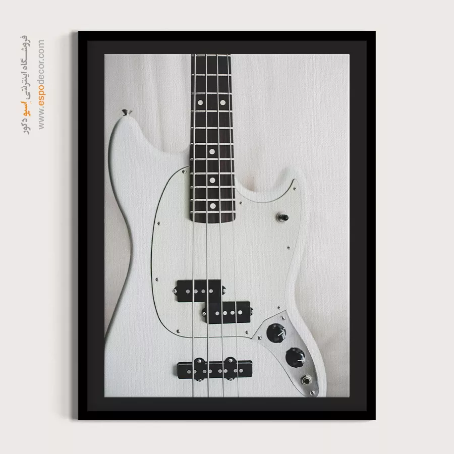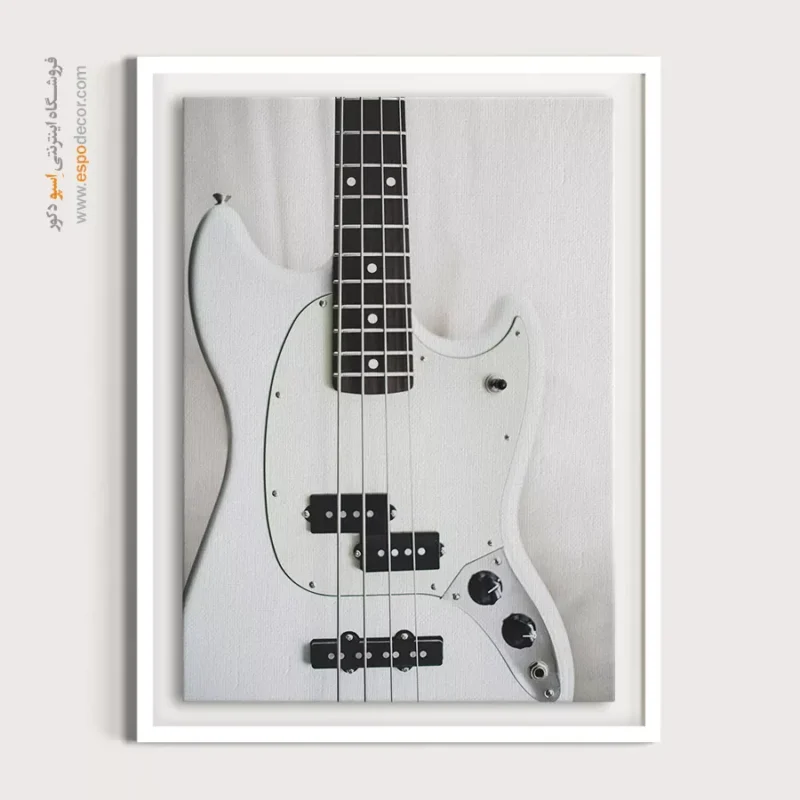 این تابلو یک نما روشن از بدنه سفید یک گیتار است که بر جزئیات آن تمرکز دارد. تضاد قوی میان سفیدی بدنه و تیرگی پیکاپ‌ها و دسته‌ی فرت‌بورد، یک جلوه بصری هندسی و مینیمال ایجاد کرده که حسی از کیفیت و ریتم را القا می‌کند. این تابلو برای دکوراسیون فضاهای مدرن، اتاق‌های موسیقی و هر محیطی که به دنبال یک نقطه کانونی روشن و با تم هنری است، انتخابی ایده‌آل می‌باشد.