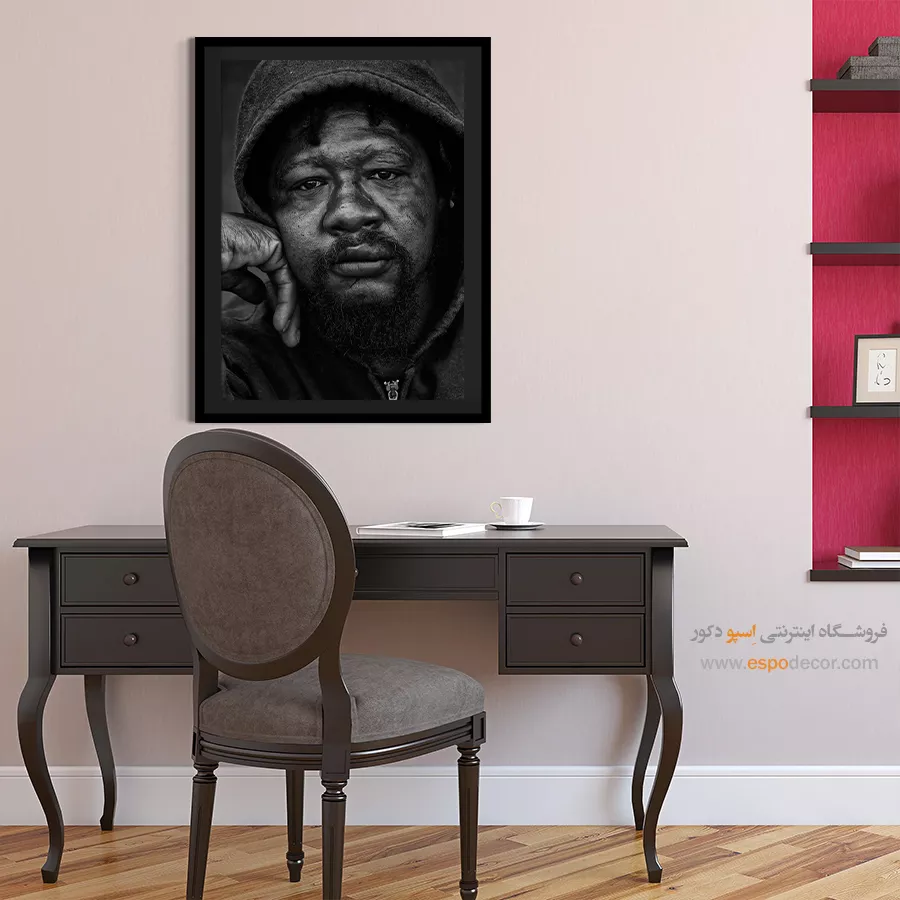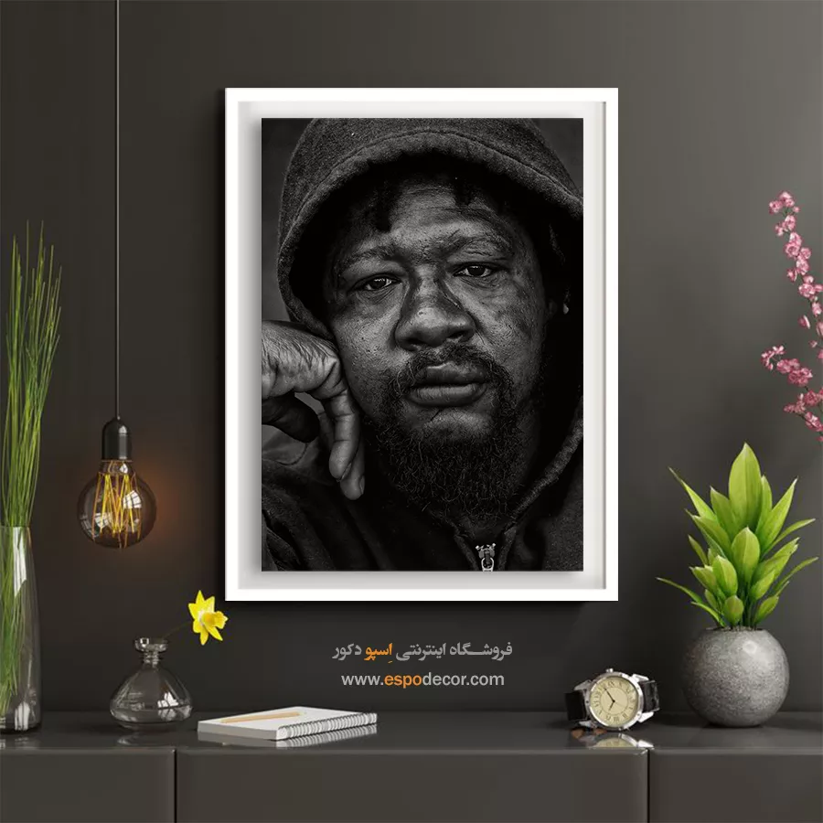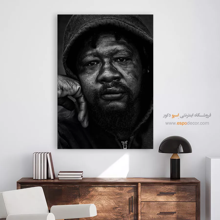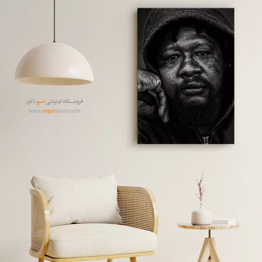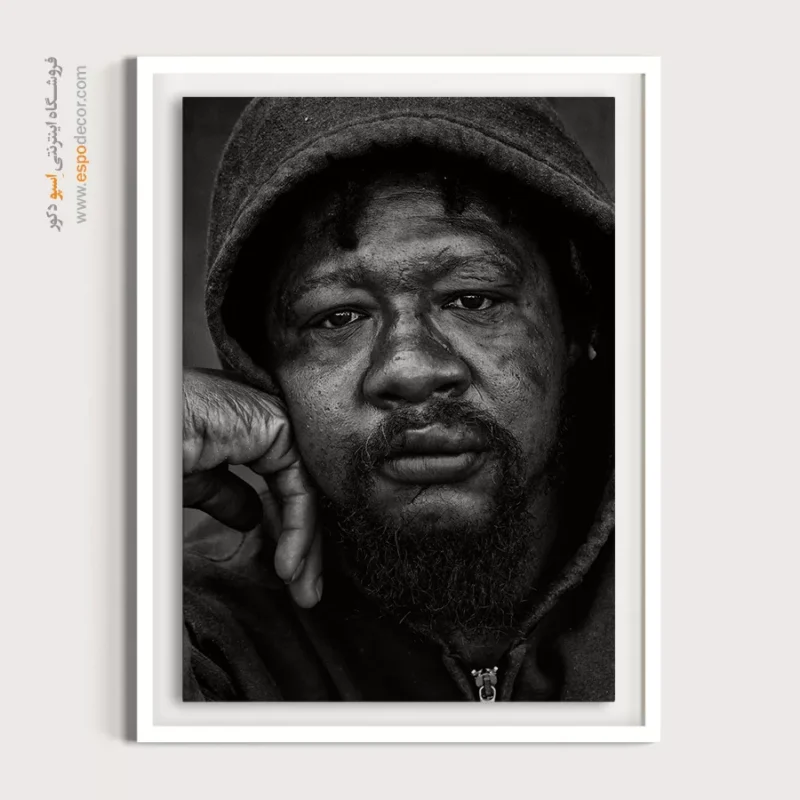 این تصویر یک عکس پرتره نزدیک با کنتراست شدید است که چهره مردی را نشان می‌دهد که دست خود را زیر چانه قرار داده است. تمرکز تصویر بر بافت، جزئیات چهره و بیان عاطفی عمیق است و یک حس واقع‌گرایی، درام و هنر عکاسی پرتره را منتقل می‌کند. این پرتره برای دکوراسیون‌های با تم دارک، گالری مانند، و فضاهای با سبک‌های قوی هنری مناسب است.