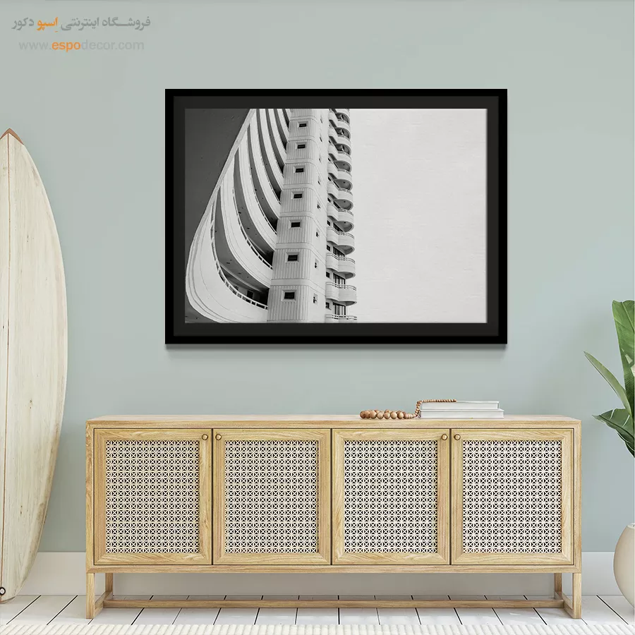 • دکوراسیون پذیرایی: یک تابلو بوم بزرگ سیاه و سفید با طرح‌های معماری هندسی یا منظره‌ای وسیع، می‌تواند دیوار اصلی پذیرایی شما را به گالری هنری تبدیل کند.