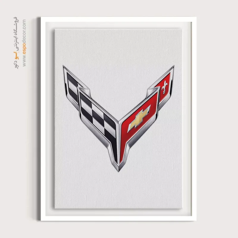 این طرح، لوگوی برجسته کوروت را به نمایش میگذارد که نمادینترین نشان در تاریخ خودروهای اسپرت آمریکا است. لوگو به شکل یک سپر یا حرف “V” است که دو پرچم متقاطع را در خود جای داده: پرچم شطرنجی (نماد مسابقات) و پرچم دیگر که شامل **زنبق (Fleur-de-lis)** (نماد میراث فرانسوی بنیانگذار شهر دیترویت) و لوگوی کراس طلایی شورولت است. ترکیب رنگهای **قرمز آتشین، مشکی، سفید و جلوه کرومی براق**، حسی از سرعت، خطر، پیروزی و اصالت مسابقهای را القا میکند. طراحی تیز، هندسی و پویای این لوگو، قدرت و عملکرد فوقالعاده این ابرخودرو را به رخ میکشد. این تابلو یک قطعه بیانیهای (Statement Piece) برای گاراژهای حرفهای، اتاقهای گیمینگ و فضاهای علاقهمندان به سرعت است.جلوه چاپ: وضوح شطرنجیها و درخشش فلز روی بوم گالری با دوام