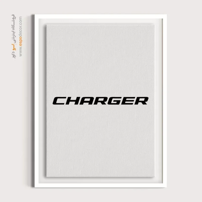 تابلو بوم لوگوی رسمی **Charger** تجسمی از قدرت مطلق و روحیه ماسل کار مدرن است که با تایپوگرافی قاطع و شیب‌دار، حسی از سرعت بی‌محابا را منتقل می‌کند؛ این اثر هنری با **چاپ با کیفیت گالری** و بالاترین وضوح حروف روی بوم کتان مرغوب، یک قطعه دکوراتیو انحصاری و لوکس، موجود با قاب‌های مدرن مشکی و سفید است.