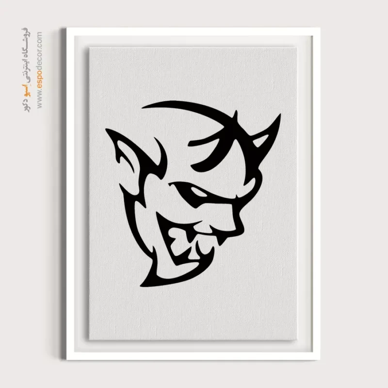 این طرح، لوگوی برجسته **دیمون** (Demon) از زیرمجموعه عملکرد بالای دوج را به صورت کاملاً مشکی و گرافیکی به نمایش می‌گذارد. چهره این موجود، با شاخ‌های تیز، گوش‌های نوک‌تیز، نگاهی خشمگین و لبخندی تهاجمی، حسی از **قدرت بی‌حد و مرز، سرعت حماسی و خشم کنترل نشده** را القا می‌کند. طراحی لوگو کاملاً ارگانیک و پویا است که در تضاد با خطوط ساده و هندسی بسیاری از لوگوهای مدرن قرار دارد. رنگ غالب **مشکی مطلق** روی پس‌زمینه سفید خالص است که کنتراست شدید، و بیانی قوی از یک شخصیت قدرتمند و شیطانی در حوزه مسابقات را ارائه می‌دهد. این تابلو یک قطعه دکوراتیو منحصر به فرد برای گاراژهای خاص، اتاق‌های گیمینگ و فضاهای علاقه‌مندان به سرعت‌های رکوردشکن و هیجان مطلق است.
