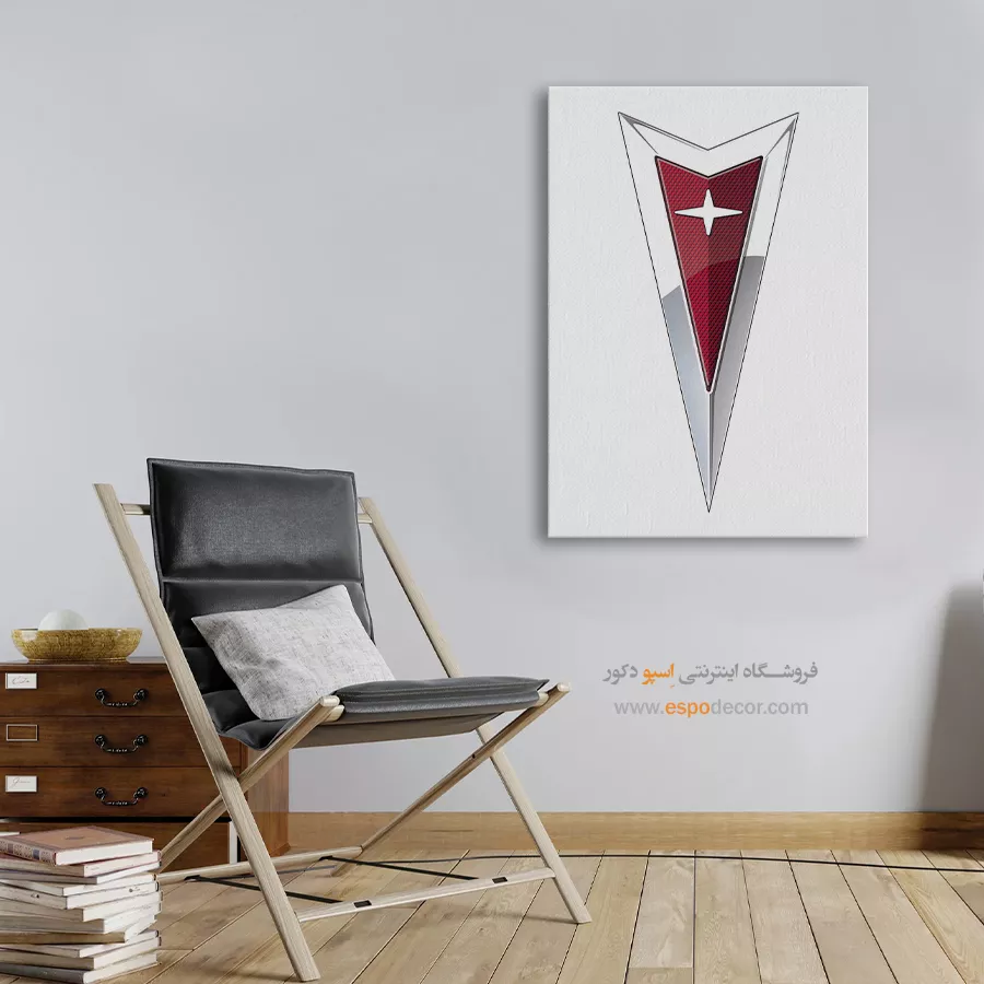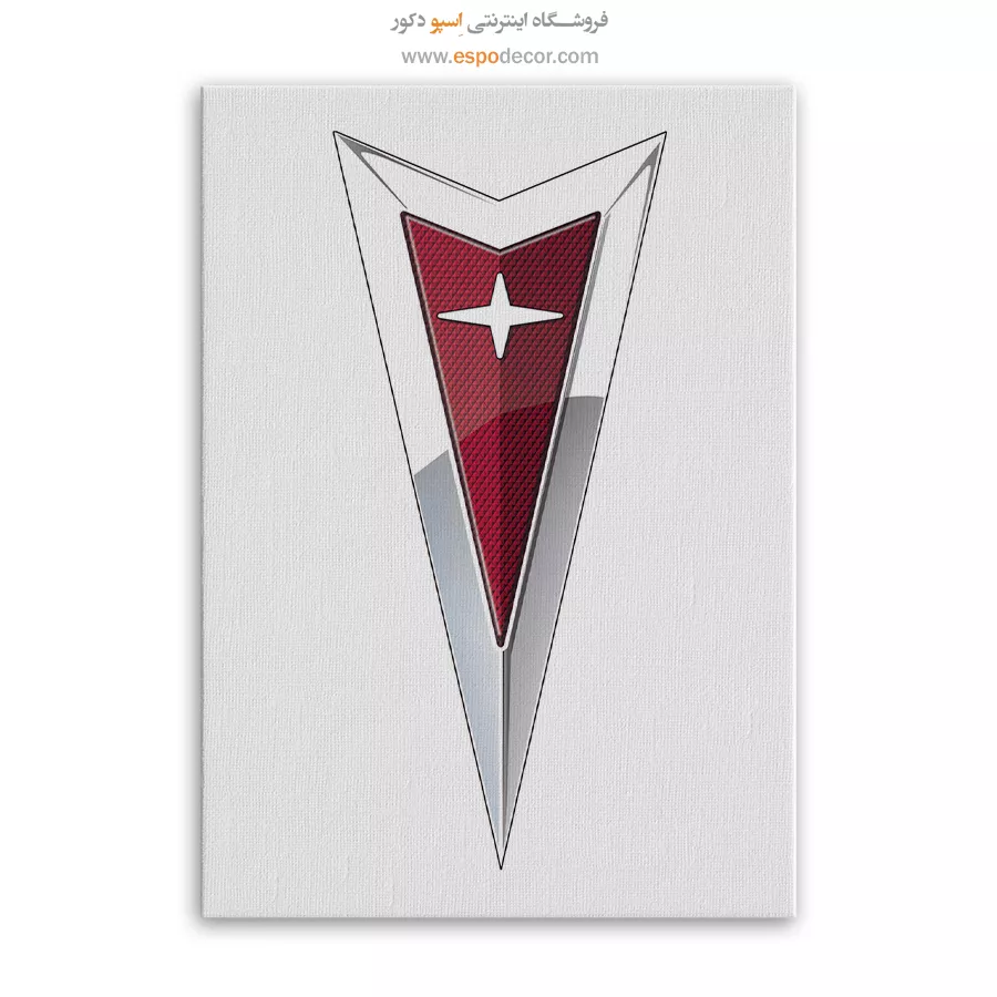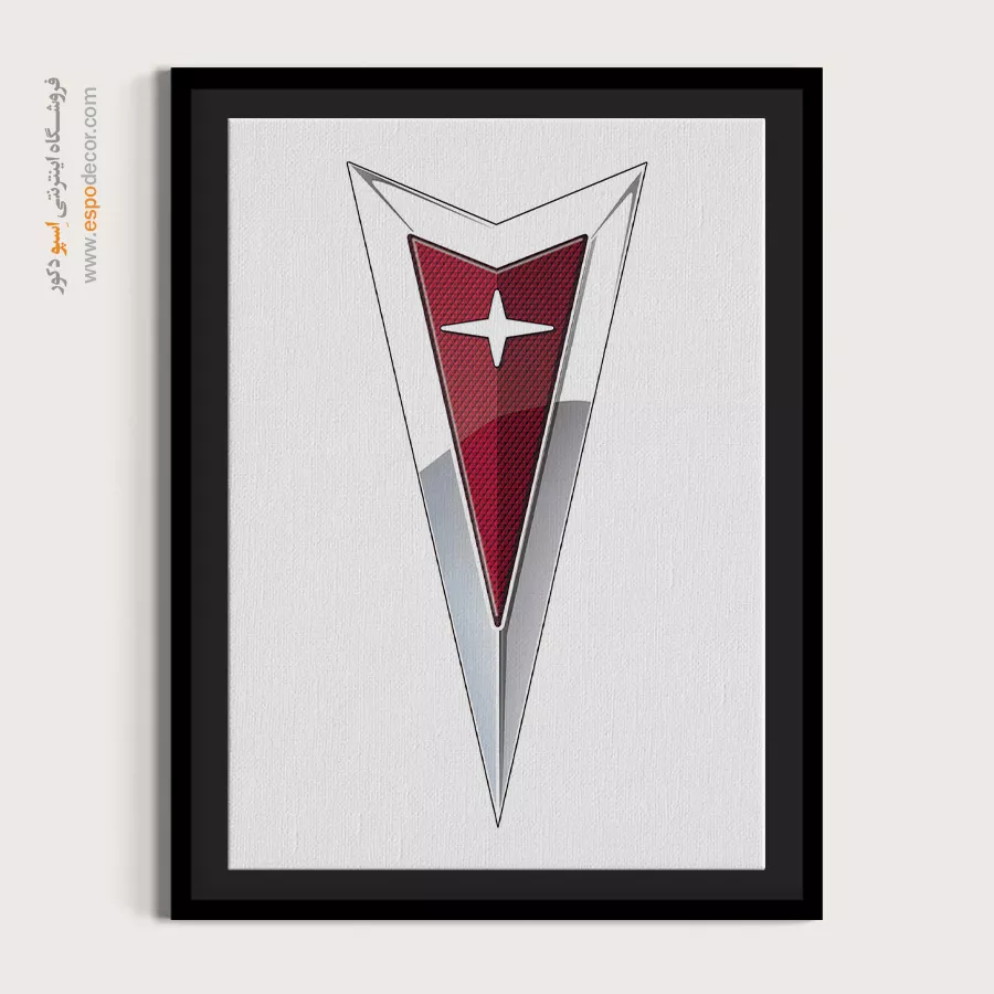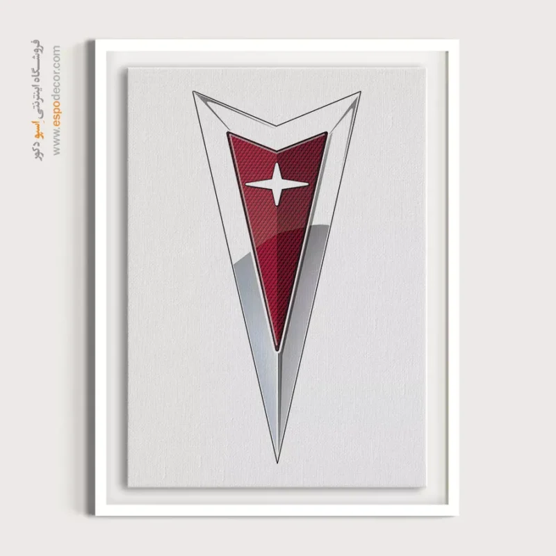 این طرح، لوگوی برجسته و پویا برند فقید **پونتیاک (Pontiac)**، معروف به **”پیکان” یا “دارت”** را به صورت سهبُعدی به نمایش میگذارد. لوگو یک شکل **V-شکل معکوس و نوکتیز** است که حسی قوی از **سرعت، جهتگیری رو به جلو و عملکرد تهاجمی** را القا میکند. قاب خارجی با جلوه **کرومی براق** طراحی شده که نماد کیفیت و استحکام است. بخش داخلی با رنگ **قرمز عمیق و طرح بافت کربنی** (یا شطرنجی) پر شده که شور و هیجان موتوراسپرت و تمرکز پونتیاک بر خودروهای عضلانی و اسپرت را منعکس میکند. یک **ستاره چهار پر سفید** در مرکز، به عنوان نقطه کانونی و نماد درخشش برند عمل میکند. این تابلو یک قطعه دکوراتیو ضروری برای طرفداران خودروهای عضلانی (Muscle Cars)، گاراژهای کلاسیک آمریکایی و فضاهایی است که به دنبال القای حس **جسارت، سرعت و میراث شورانگیز** هستند.جلوه چاپ: بازتولید درخشش کرومی و بافت قرمزرنگ روی بوم گالری ضد فرسایش