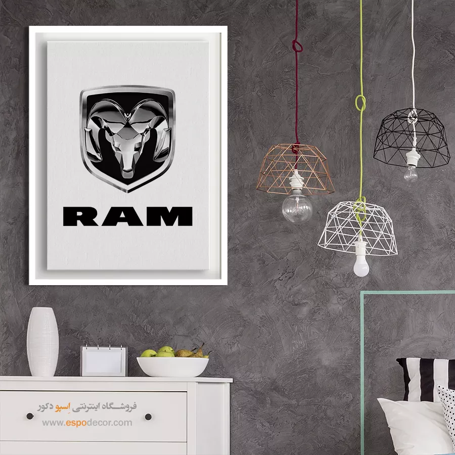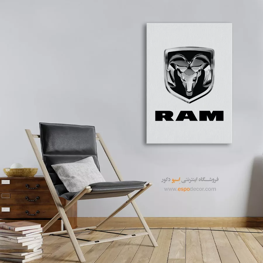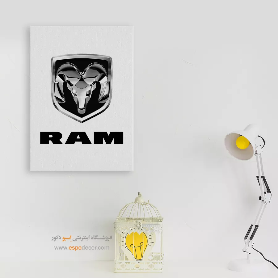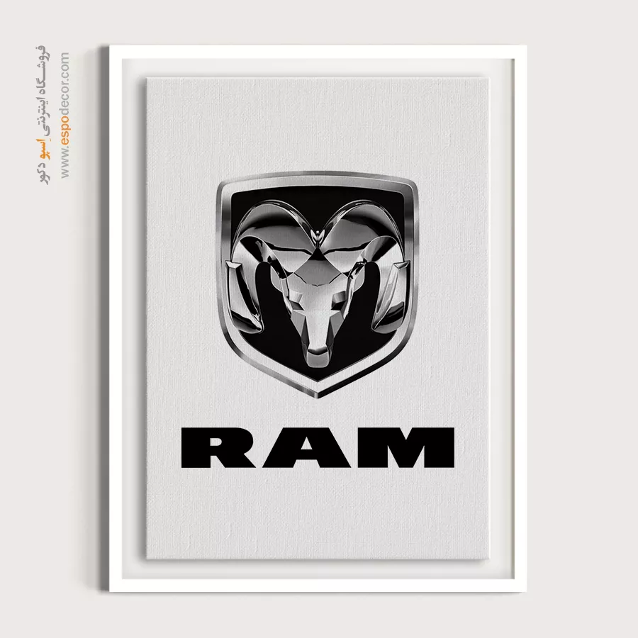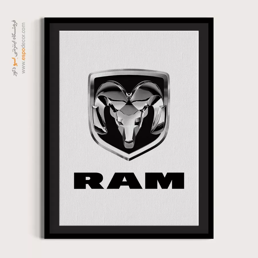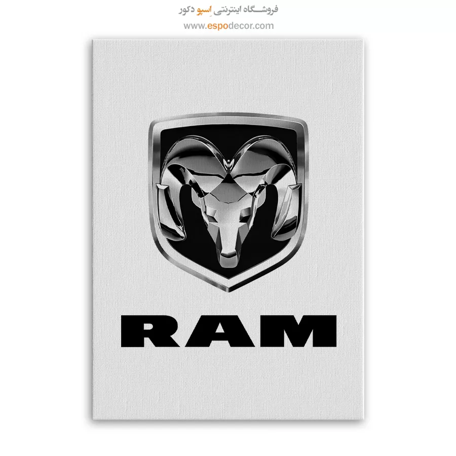 این طرح، لوگوی برجسته و قدرتمند برند **رم (Ram)** را به نمایش میگذارد. لوگو از دو بخش اصلی تشکیل شده است: نماد **سر قوچ (Ram)** به صورت سهبُعدی و کرومی در یک قاب **سپر** در بخش بالایی، و نام نوشتاری **RAM** با فونتی بلوکمانند و قاطع در پایین. سر قوچ با **شاخهای بزرگ و پیچدرپیچ** و چهرهای مصمم طراحی شده که حسی قوی از **مقاومت، سرسختی، قدرت بیپایان و توانایی عبور از هر مانعی** را منتقل میکند. جلوه **کرومی براق** نشان، کیفیت ساخت و استحکام صنعتی برند را برجسته میسازد. تایپوگرافی پررنگ و هندسی **RAM**، بدون هیچگونه تزئین اضافی، بر سادگی، قدرت و حضور محکم برند تأکید دارد. این تابلو یک قطعه دکوراتیو ضروری برای گاراژهای خودروهای سنگین، دفاتر ساخت و ساز و فضاهایی است که به دنبال القای حس **قدرت، اراده و کارایی بینظیر** هستند.جلوه چاپ: بازتولید درخشش کرومی و عمق سهبُعدی روی بوم گالری ضد فرسایش