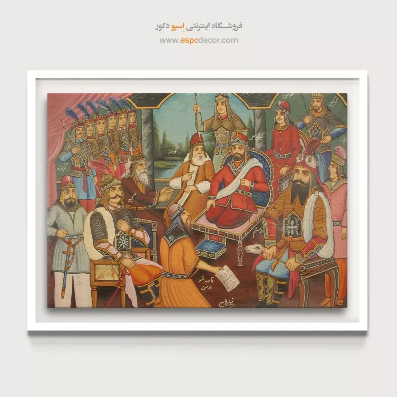 رستم به حضور شاه کیکاووس رسید – تابلو نقاشی قهوه خانه ای