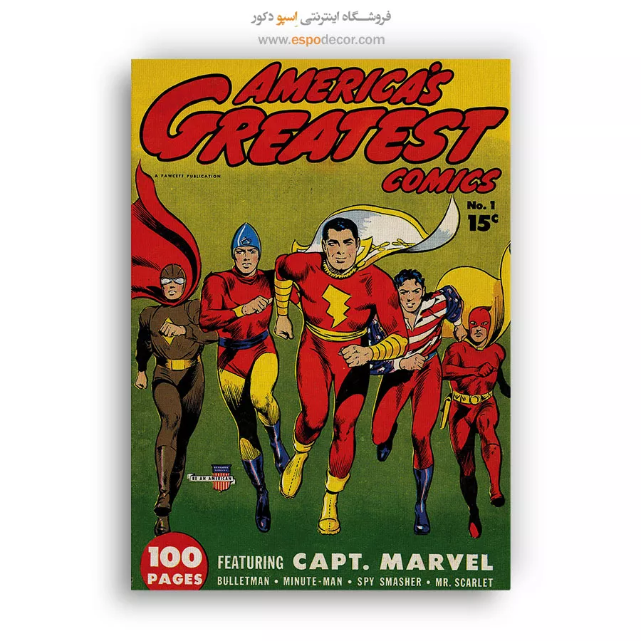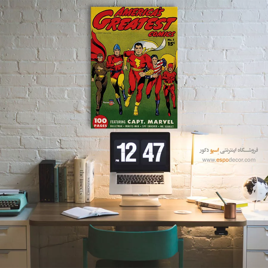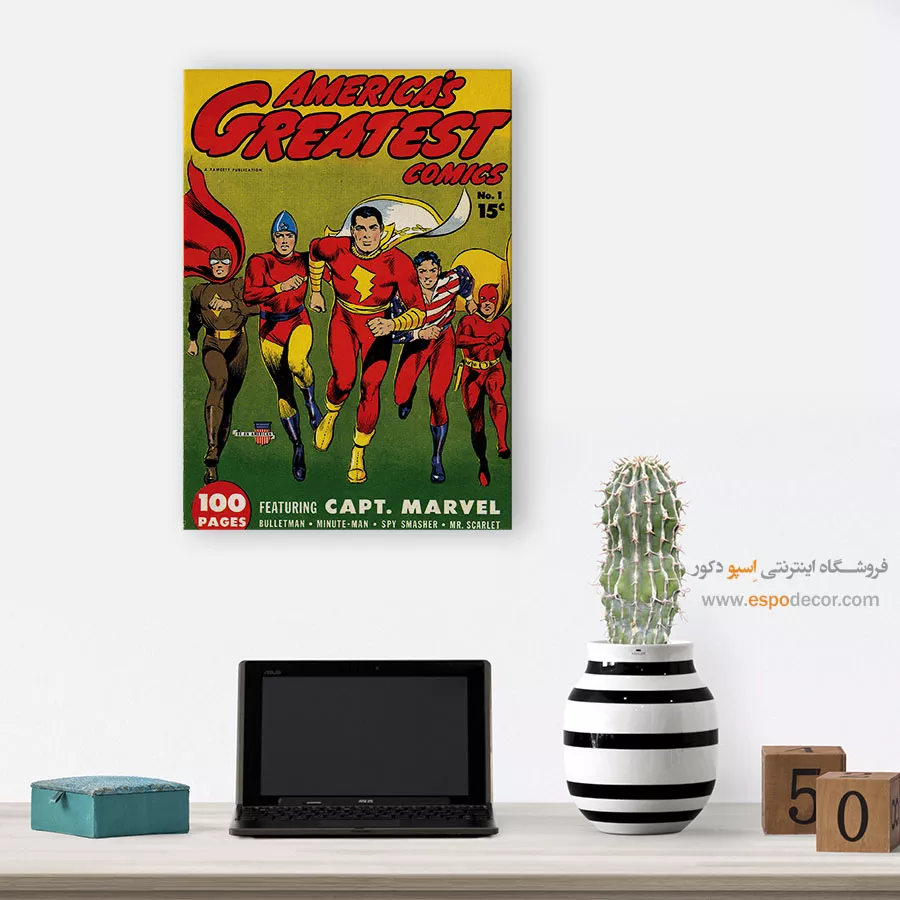 یک قاب از دنیای خیال؛ تابلو بوم مجله کمیک، تلفیقی از رنگ، روایت و شخصیت. جلد مجله هایی که بر دیوار جان میگیرند؛ مناسب برای آنان که با قهرمانان، بزرگ شدهاند.