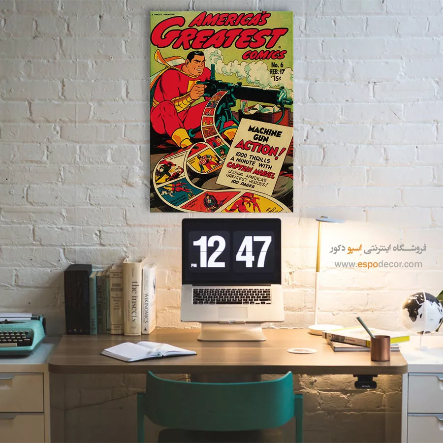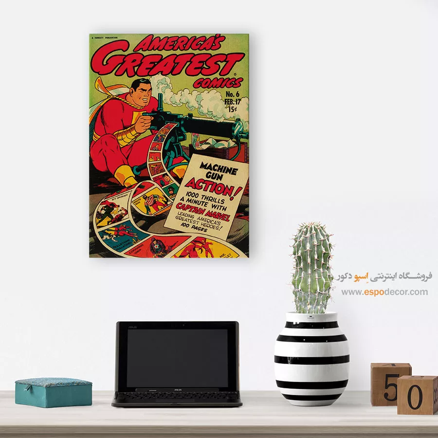 یک قاب از دنیای خیال؛ تابلو بوم مجله کمیک، تلفیقی از رنگ، روایت و شخصیت. جلد مجله هایی که بر دیوار جان میگیرند؛ مناسب برای آنان که با قهرمانان، بزرگ شدهاند.
