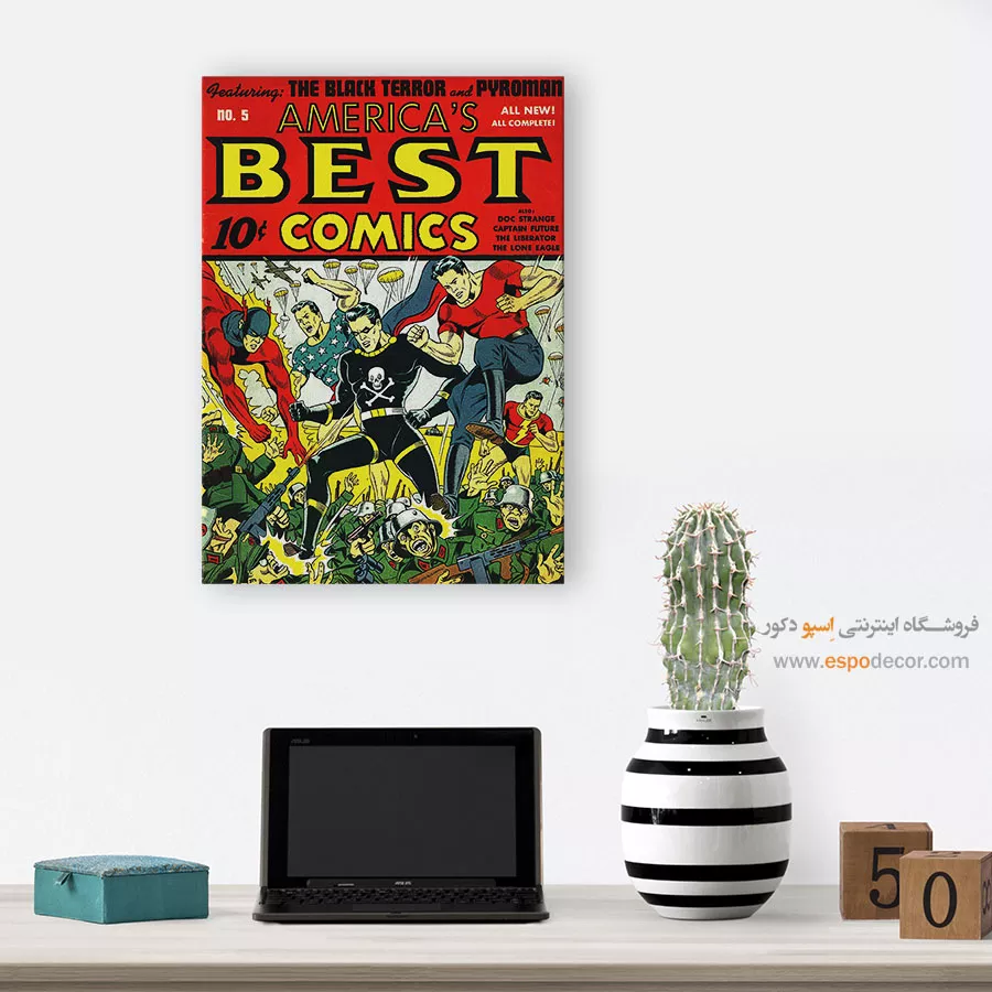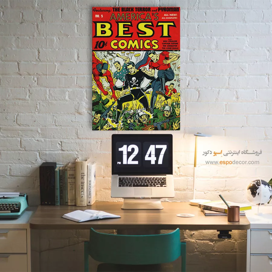 یک قاب از دنیای خیال؛ تابلو بوم مجله کمیک، تلفیقی از رنگ، روایت و شخصیت. جلد مجله هایی که بر دیوار جان میگیرند؛ مناسب برای آنان که با قهرمانان، بزرگ شدهاند.