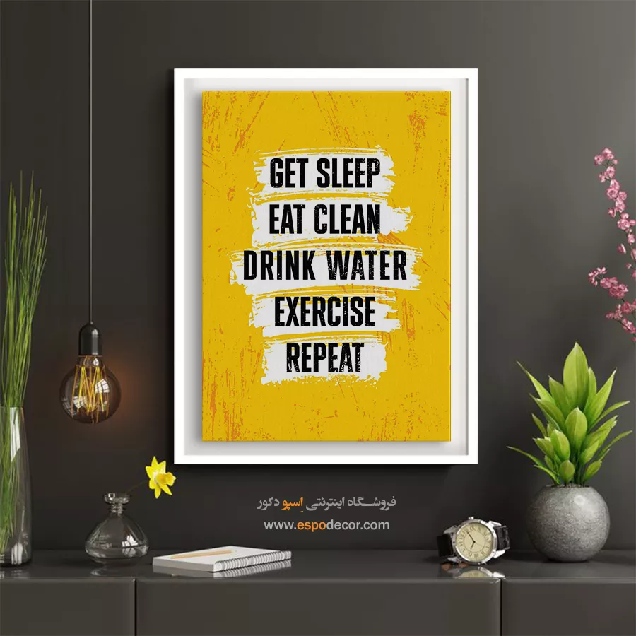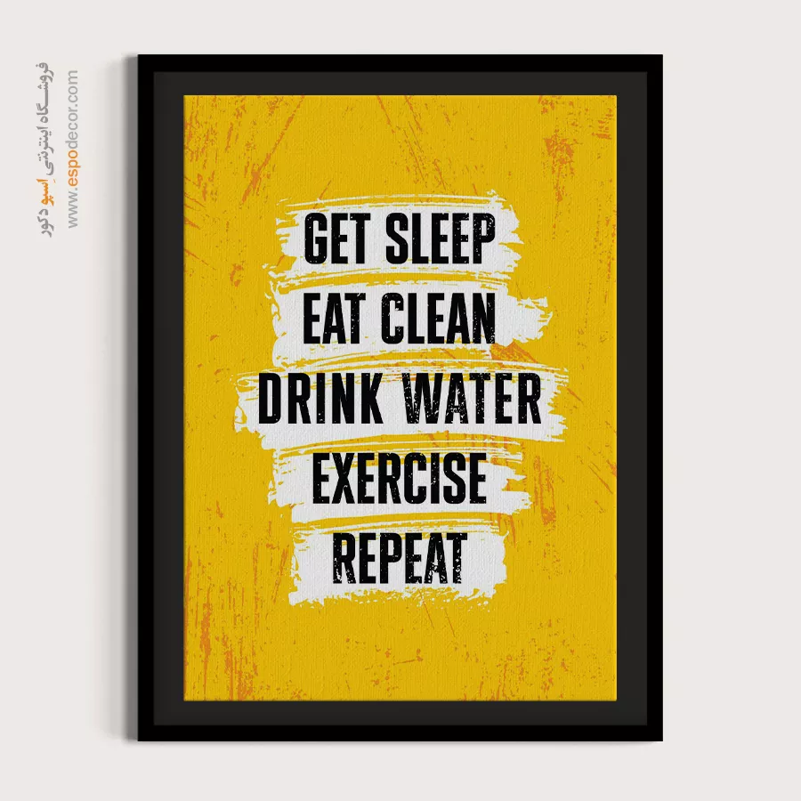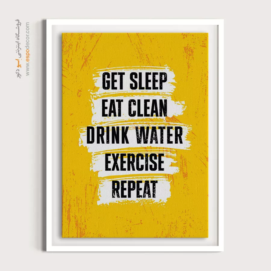 خوابیدن،سالم خوردن،آب نوشیدن،ورزش،تکرار – تابلو تایپوگرافی انگلیسی