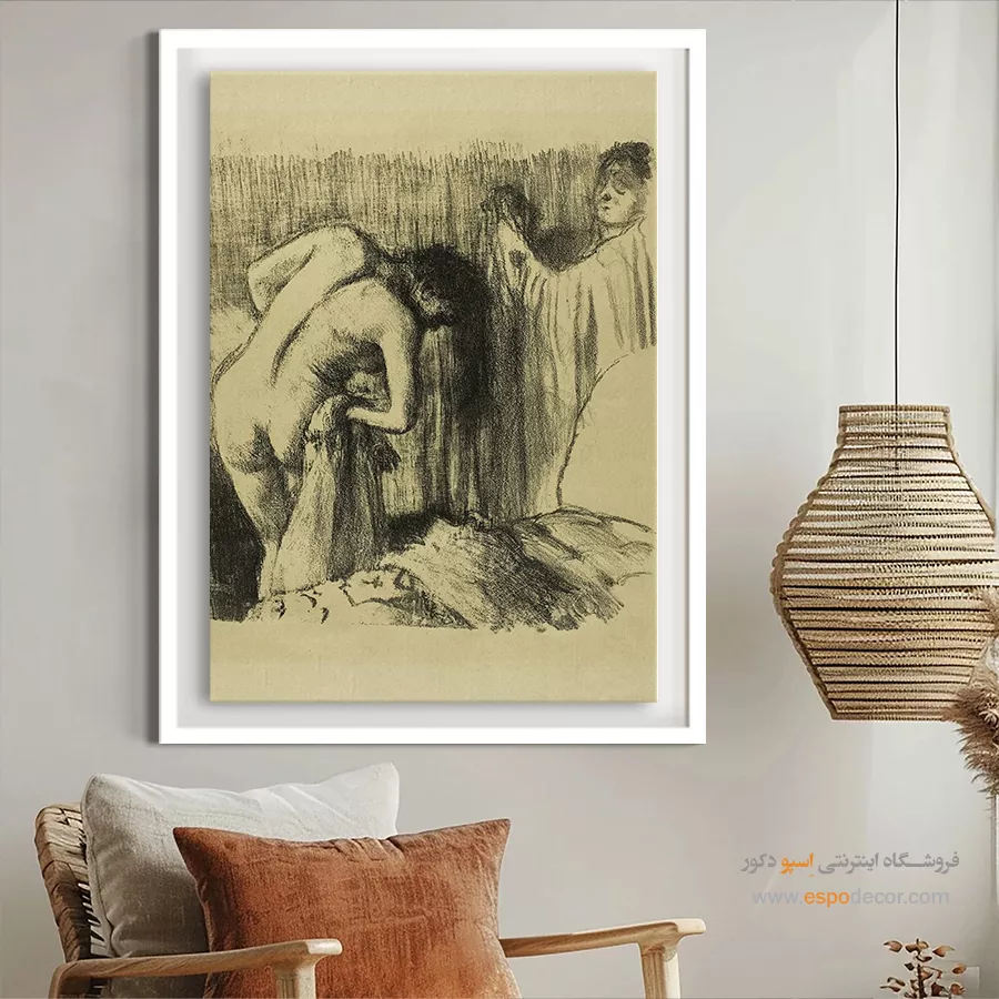 زن در حال خشککردن خود بعد از حمام با جزئیاتی دقیق نقاشی شده است. ترکیب رنگهای گرم و ابعاد چشمگیر، تابلو را برجستهتر میکند. انتخابی عالی برای خرید تابلو هنری دیواری بزرگ و شاخص.
