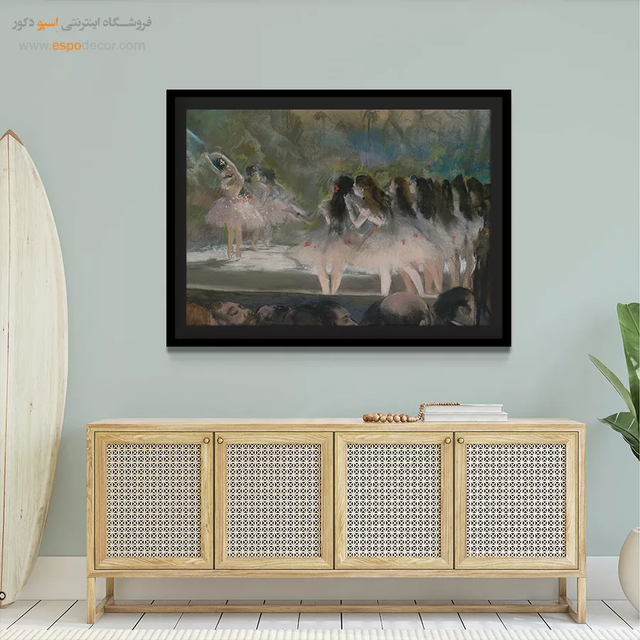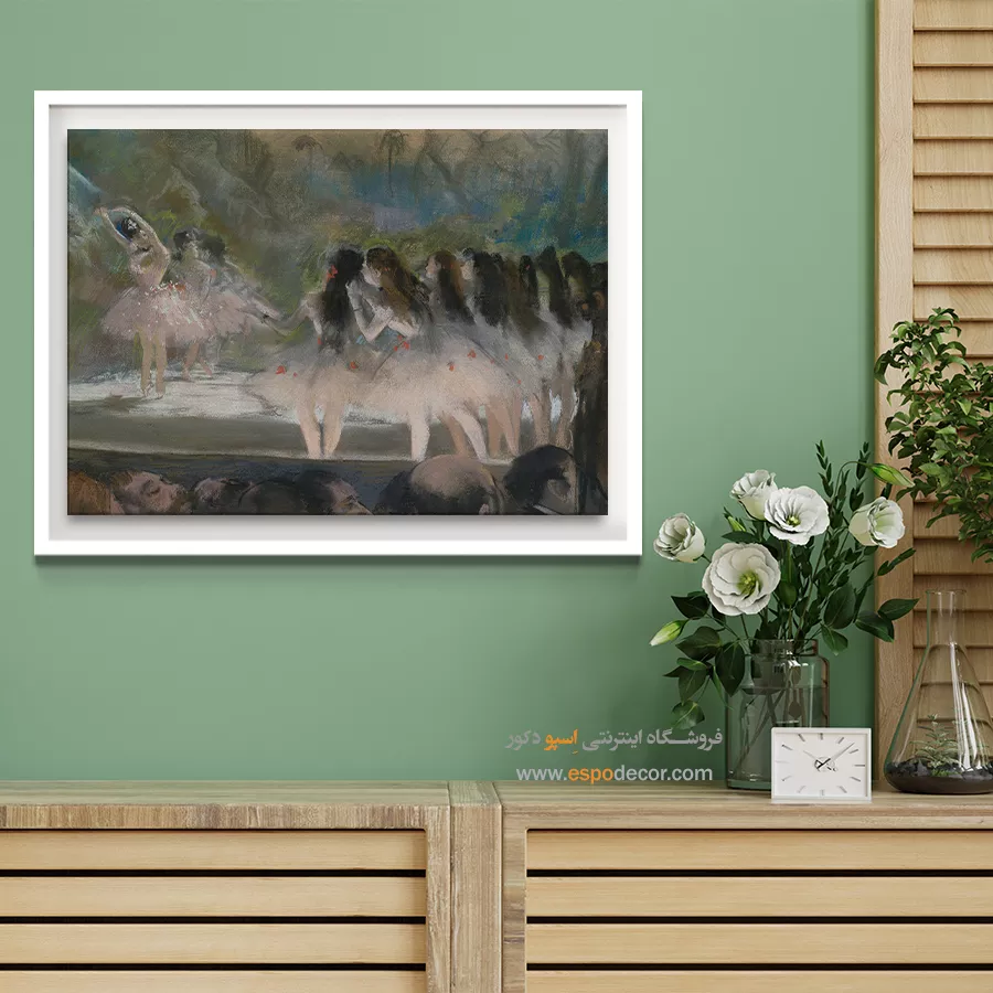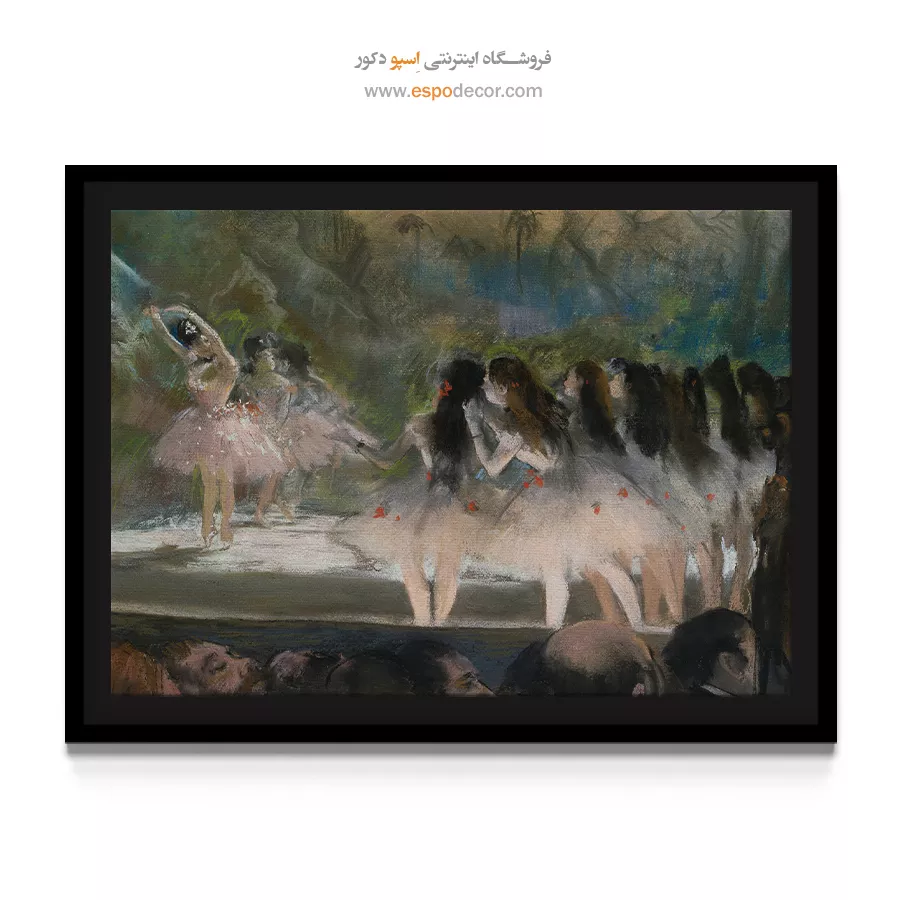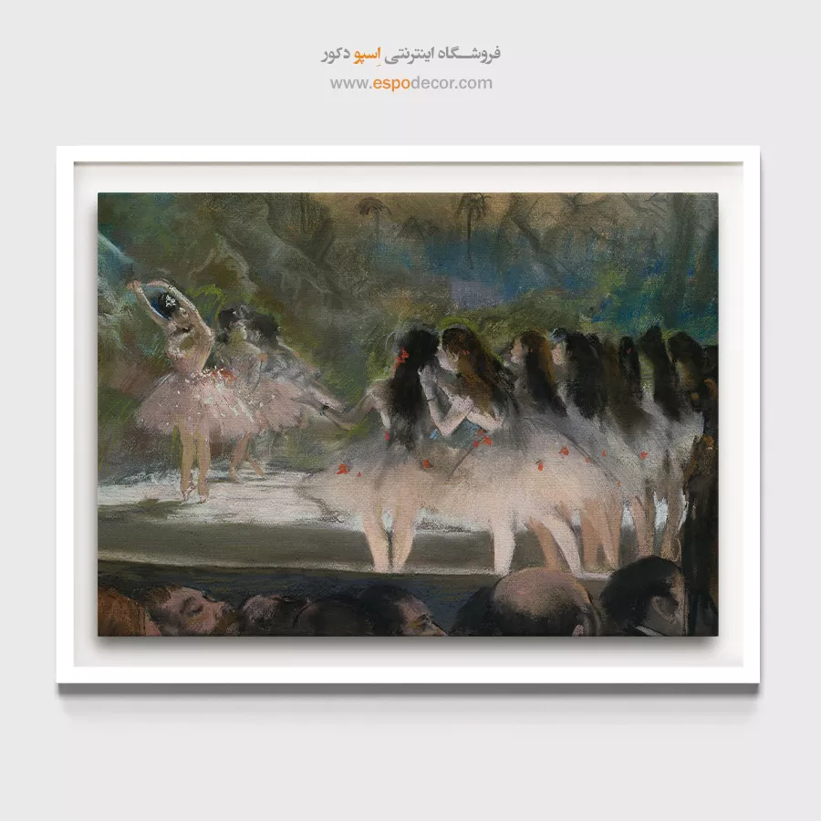 گروهی از بالرینهای اپرای پاریس در نور باشکوه صحنه تصویر شدهاند. لباسهای سفید و حرکات هماهنگ، روح اجرای باله را زنده میکنند. این تصویر انتخابی خاص برای علاقهمندان به تابلو نقاشی رقصندههای باله است و جلوهای بینظیر به پذیرایی یا سالنهای بزرگ میدهد.