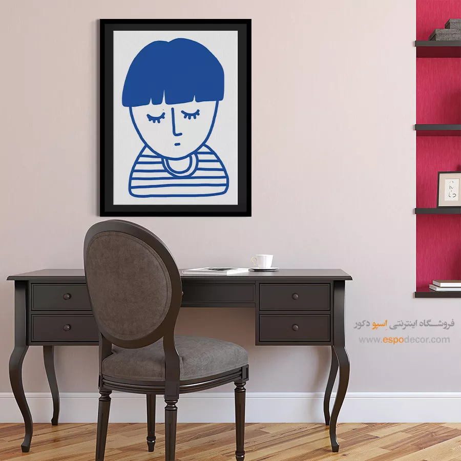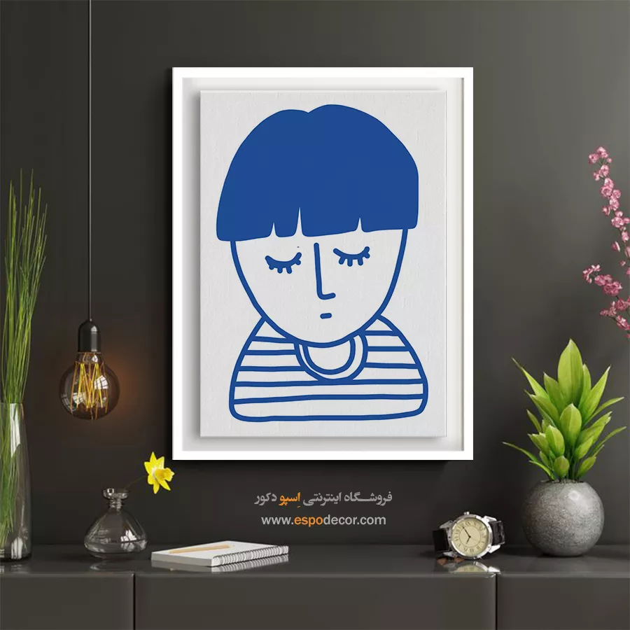 • انتخاب سایه‌های مختلف از رنگ دیوار: مانند تابلو آبی تیره روی دیوار آبی روشن، که حس آرامش و یکپارچگی در فضا ایجاد می‌کند.