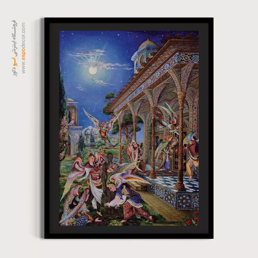 تابلوی باشکوه استاد فرشچیان با تصویر فرشتگان و آفرینش، ترکیبی از رنگ‌های آبی و طلایی که حس معنویت و شکوه را القا می‌کند. انتخابی ارزشمند برای علاقه‌مندان به هنر اصیل ایرانی.