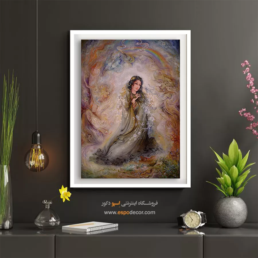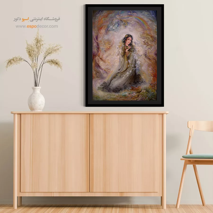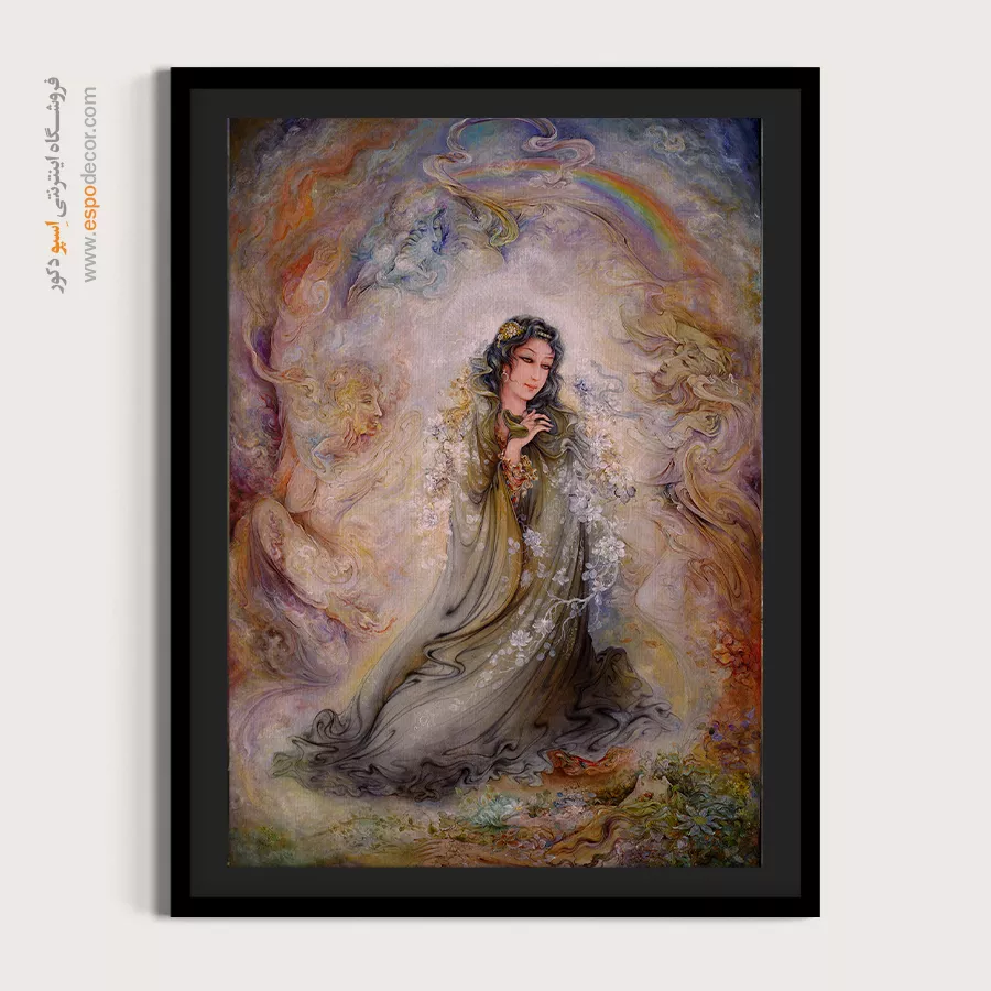 تابلوی روحنواز استاد فرشچیان، تصویری از زنی در میان نور و رنگینکمان را نمایش میدهد. اثری پر از امید و معنویت که میتواند فضایی مثبت و روحانی ایجاد کند.