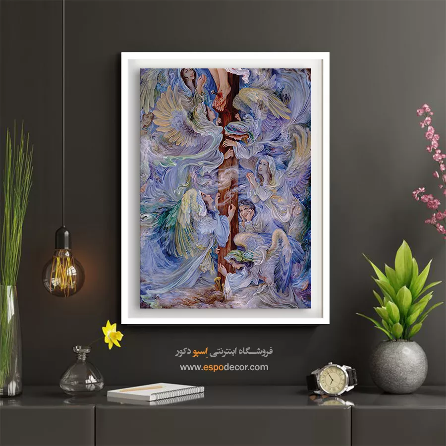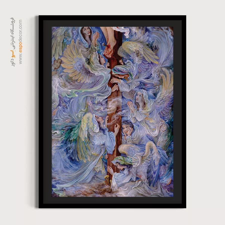 اثر تاثیرگذار استاد فرشچیان که فرشتگانی اندوهگین را پیرامون صلیب به تصویر میکشد. ترکیب رنگهای آبی و سفید، حس تقدس و معنویت عمیقی را منتقل میکند.