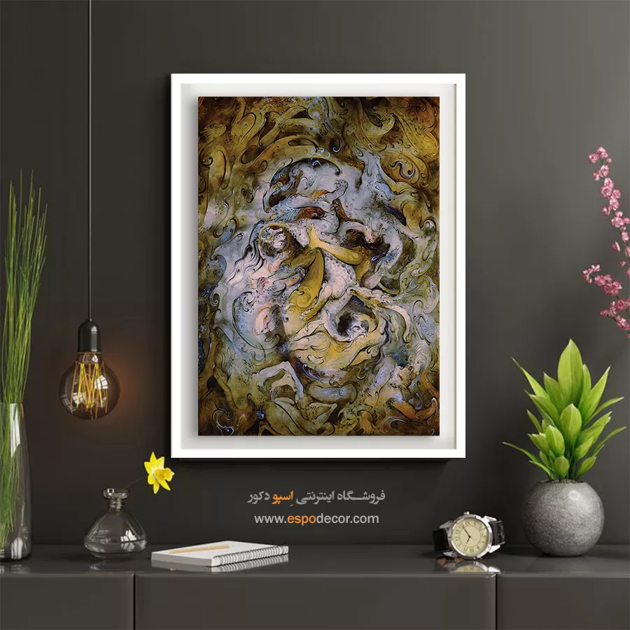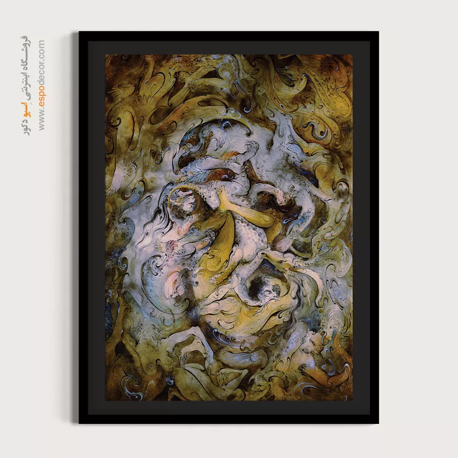 این تابلو پرشور استاد فرشچیان، صحنهای از رقص و جدال اسطورهای را به نمایش میگذارد که با رنگهای زرد و آبی فضایی حماسی آفریده است.