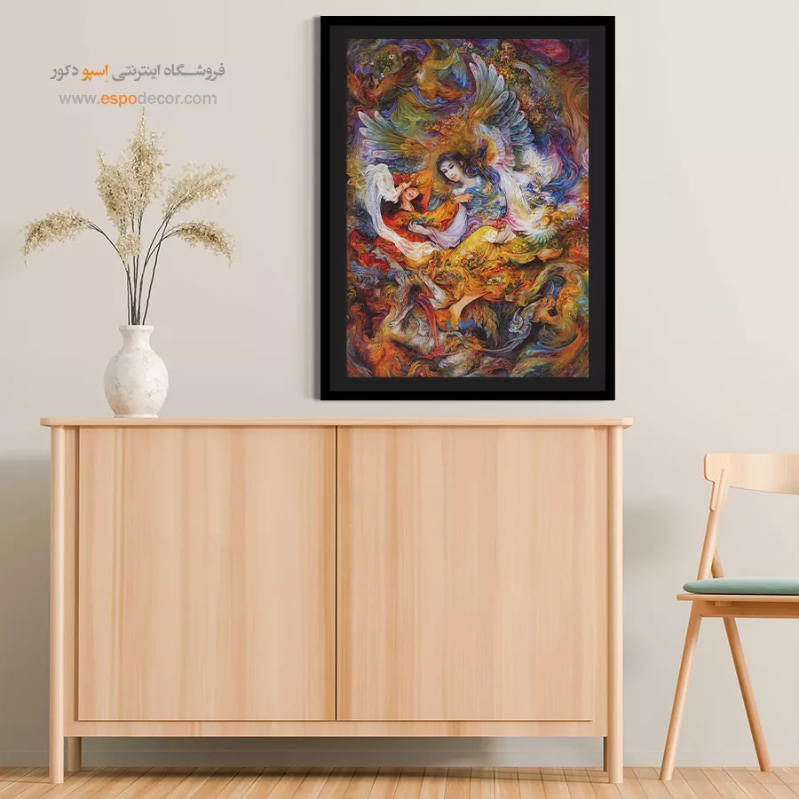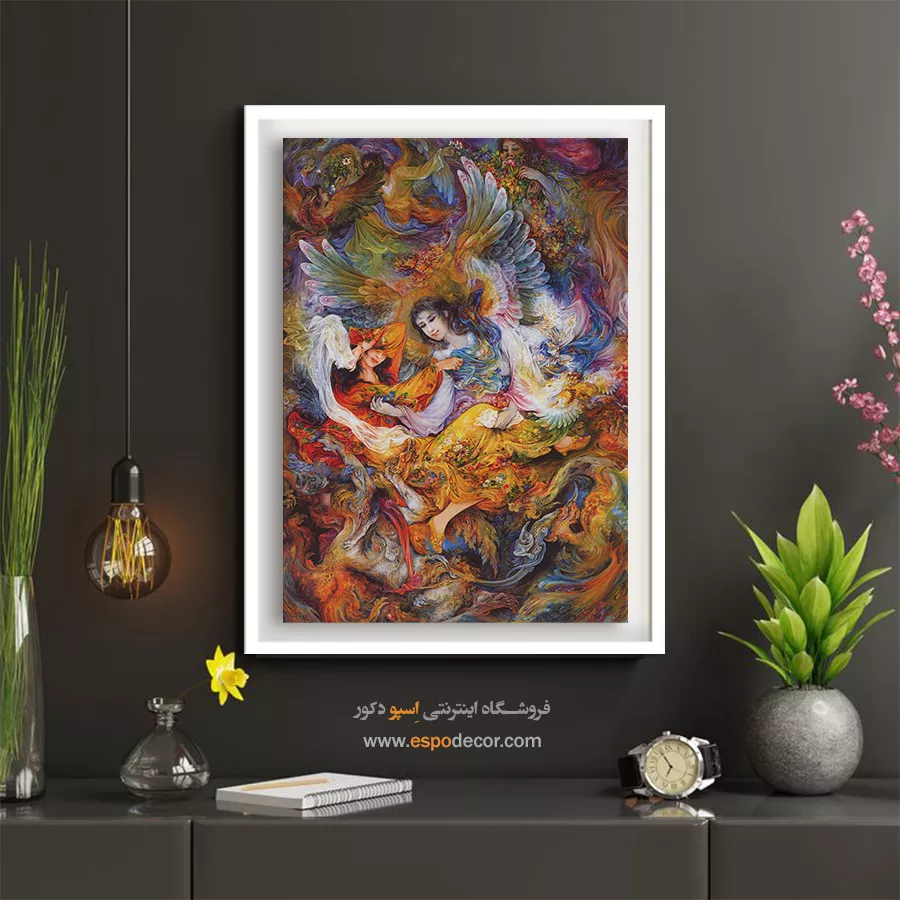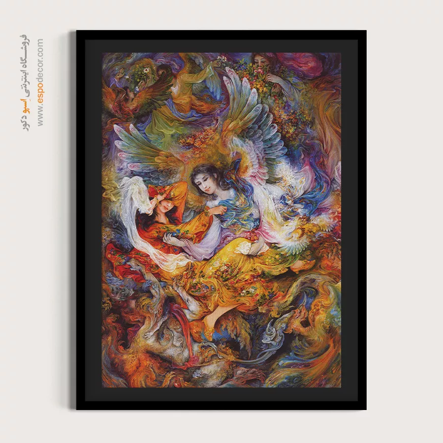 - جشن رنگها: استاد فرشچیان در این اثر از تمام پالت رنگی خود استفاده کرده است. لباس زن با رنگهای **قرمز و نارنجی** (نماد شور و اشتیاق) و بالهای فرشته با طیفهای **آبی و سفید** (نماد آرامش) نقاشی شدهاند که تضاد زیبایی ایجاد کرده است.
