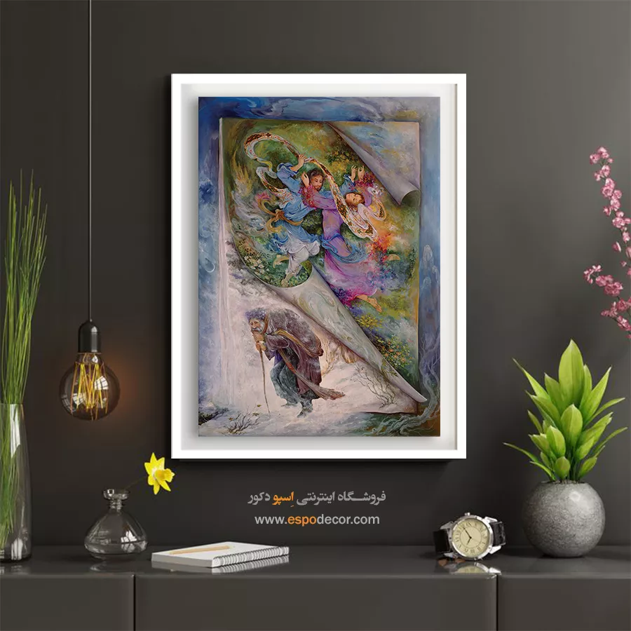 تابلو نقاشی «تقویم زندگی» که با نامهای **«جوانی و پیری»** یا **«گذر عمر»** نیز شناخته میشود، یکی از فلسفیترین و پندآموزترین آثار استاد محمود فرشچیان است. این تابلو یک آینهی تمامنما از واقعیت زندگی است؛ لحظهای که پردهی رنگارنگ جوانی کنار میرود و حقیقتِ سردِ پیری نمایان میشود. ما در اسپو دکور، این اثر تفکربرانگیز را با بالاترین کیفیت چاپ روی بوم کنواس آماده کردهایم تا نهتنها زیبایی، بلکه “معنا” را به دکوراسیون شما اضافه کنیم.تحلیل هنری و رازهای تابلو