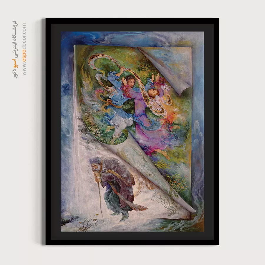 این تابلو استاد فرشچیان نمایشی از تضاد میان زمستان سرد و بهار سرسبز را با پیرمردی خمیده و رقصندگان جوان به تصویر میکشد؛ نمادی از چرخه زندگی.