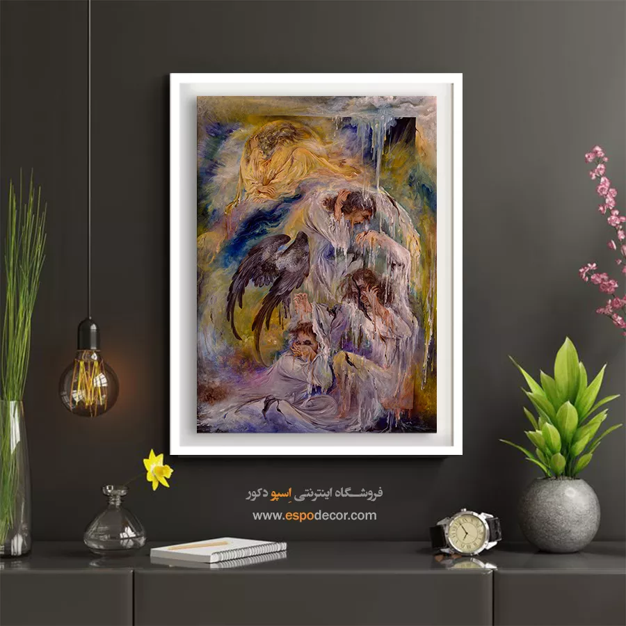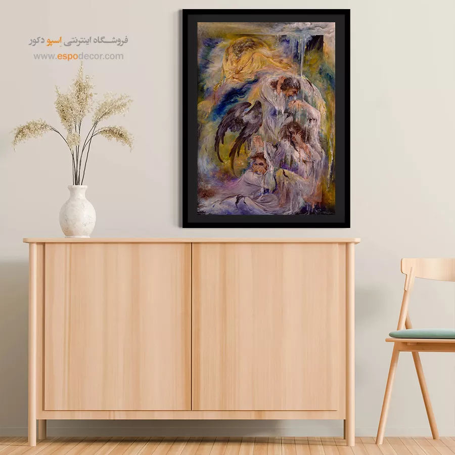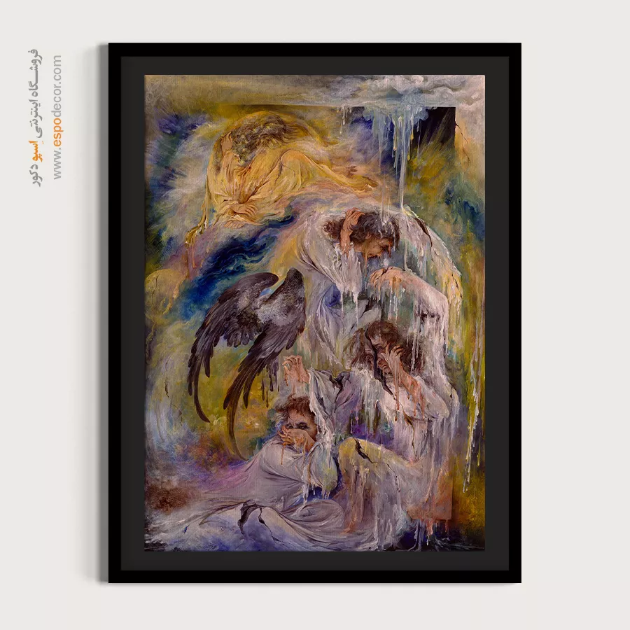 تابلوی احساسی استاد فرشچیان با تصویر فرشتگان در حال سوگواری، ترکیب رنگهای سرد و گرم که حس اندوه و معنویت را القا میکند. انتخابی عمیق برای علاقهمندان به هنر معنوی.