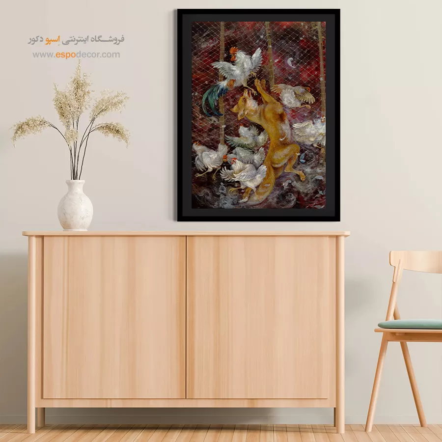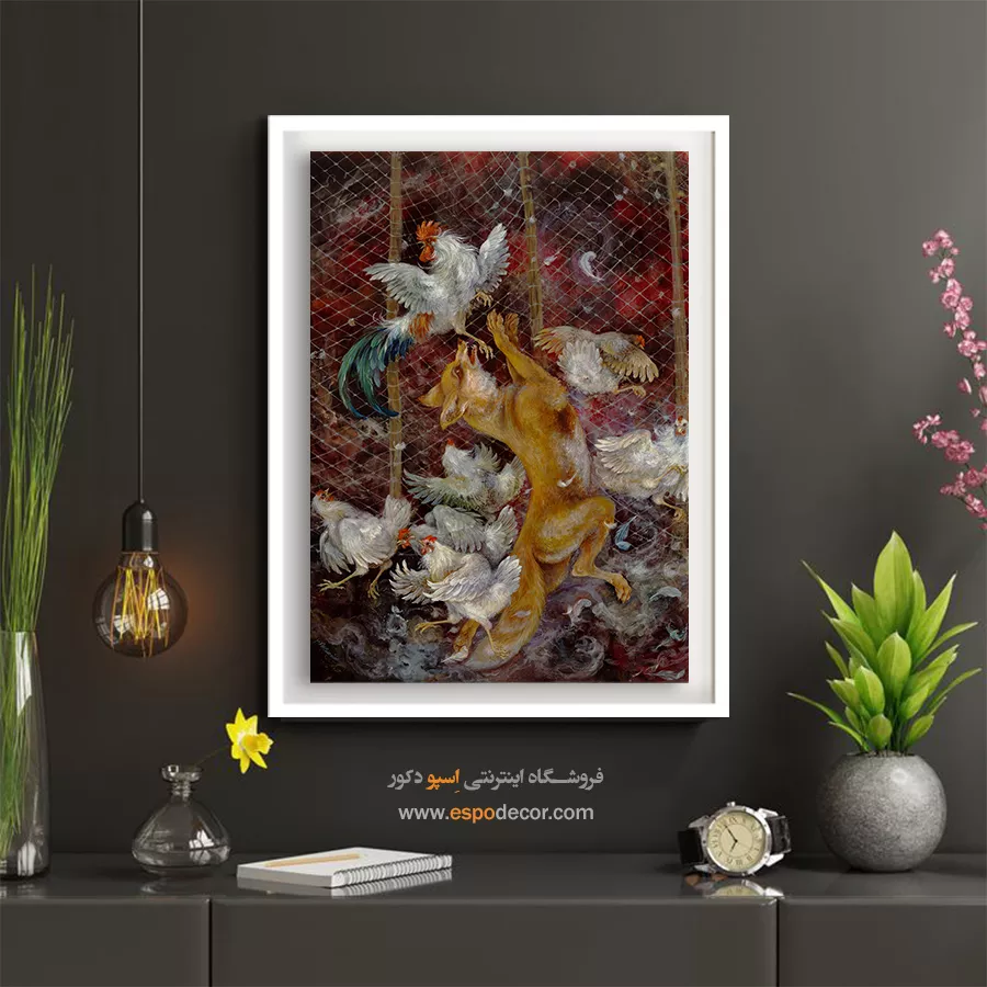 اثر پویای استاد فرشچیان که صحنه‌ای پر از جنب‌وجوش از روباه و مرغ‌ها را نشان می‌دهد. رنگ‌های قرمز و قهوه‌ای حس هیجان و تنش را القا می‌کنند. مناسب برای فضاهای پرانرژی.