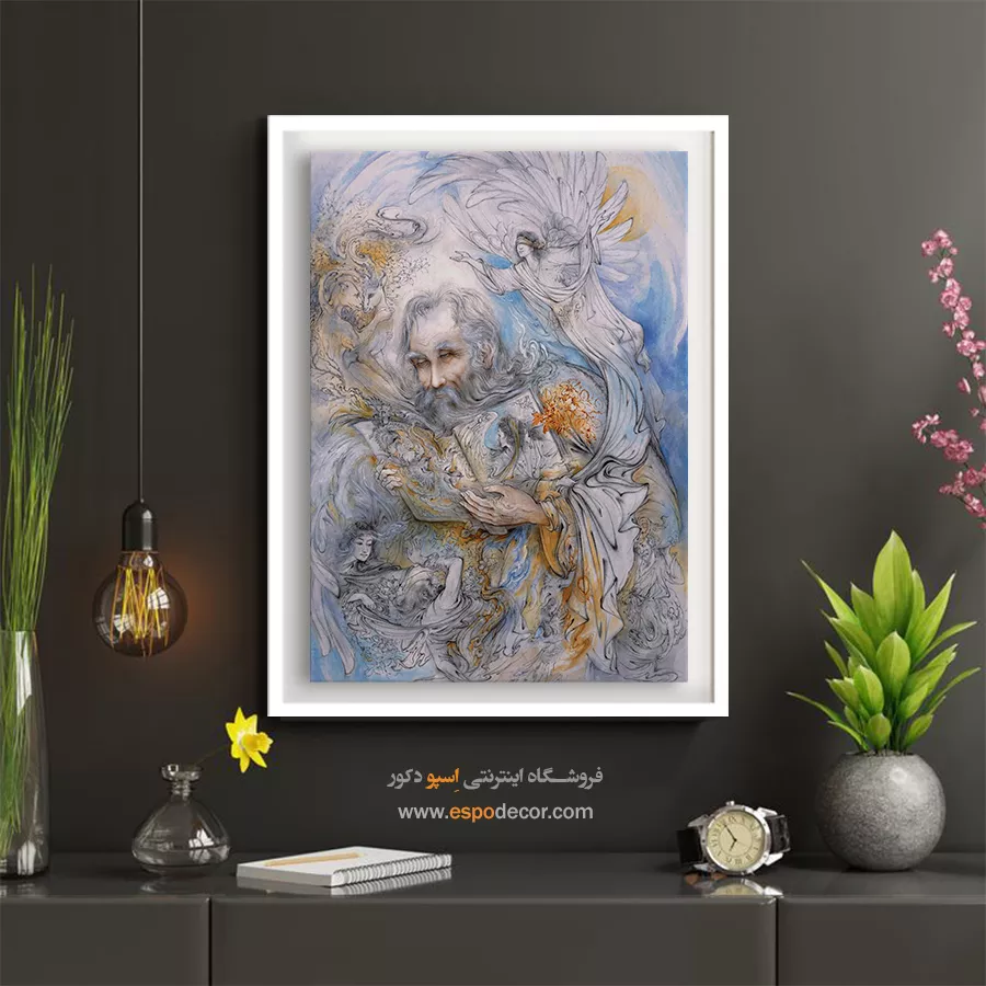 تابلو نقاشی «کتاب مقدس» که به دلیل شباهت چهره‌پردازی، در بسیاری از محافل هنری به عنوان تمثالی از **«حافظ شیرازی»** یا **«پیامبر»** نیز شناخته می‌شود، یکی از روحانی‌ترین آثار استاد محمود فرشچیان است. این اثر لحظه‌ای را به تصویر می‌کشد که پیری فرزانه، غرق در مطالعه‌ی کتابی است که گویی کلماتش از جنس نور و فرشته هستند. ما در اسپو دکور، این تابلوی آرام‌بخش و معنوی را با حفظ تمام ظرافت‌های طراحی مدادی و آبرنگی آن، روی بوم کنواس چاپ کرده‌ایم.