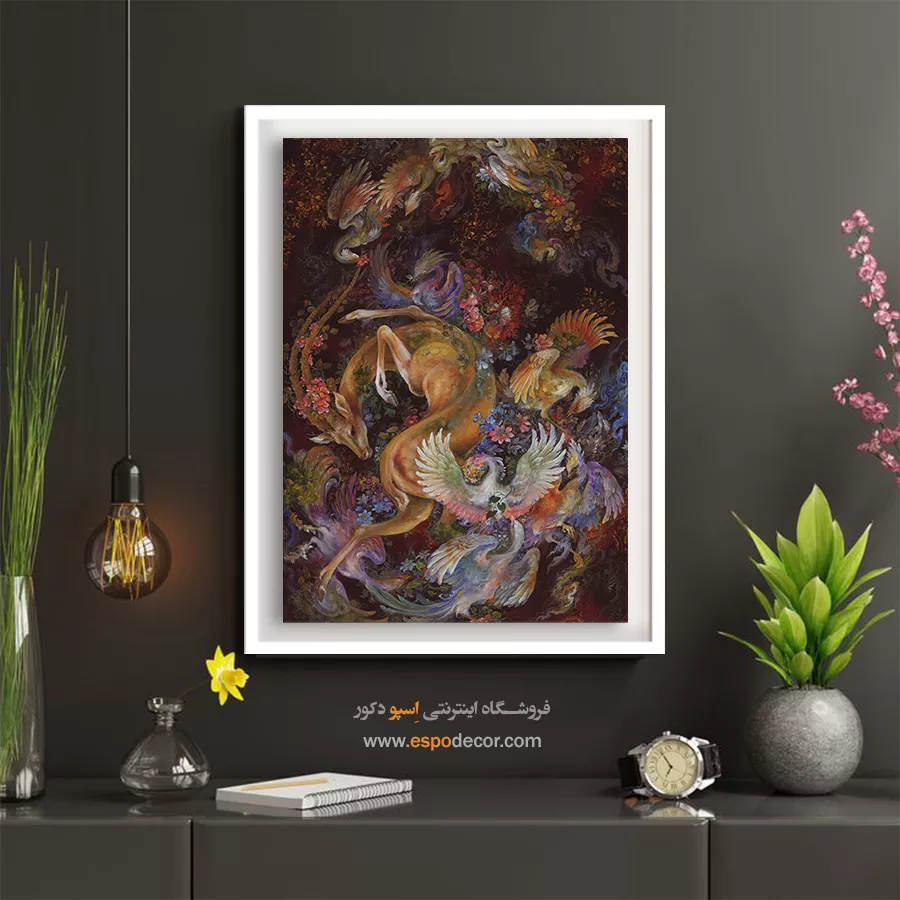 تابلو نقاشی «چشمه هوا» که با نامهای **«غزال و پرندگان بهشتی»** یا **«غنای طبیعت»** نیز شناخته میشود، یکی از پرجزئیاتترین و اسرارآمیزترین آثار استاد محمود فرشچیان است. این اثر نمادی از آمیختگی حیوانات وحشی و موجودات اساطیری در دل طبیعت پر رمز و راز است. عنوان «چشمه هوا» اشاره به منشأ آرزوها، خواستهها و هوای نفس انسان دارد که در زیباترین شکل ممکن به تصویر کشیده شده است. ما در اسپو دکور، این تابلوی باوقار را با بالاترین کیفیت چاپ روی بوم کنواس آماده کردهایم تا حس عمق و اصالت را به دکوراسیون شما ببخشد.تحلیل هنری و تکنیک لوکس اثر