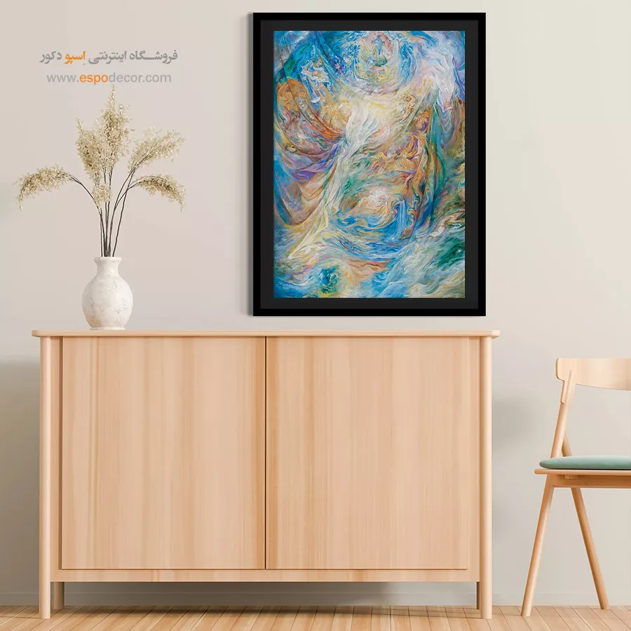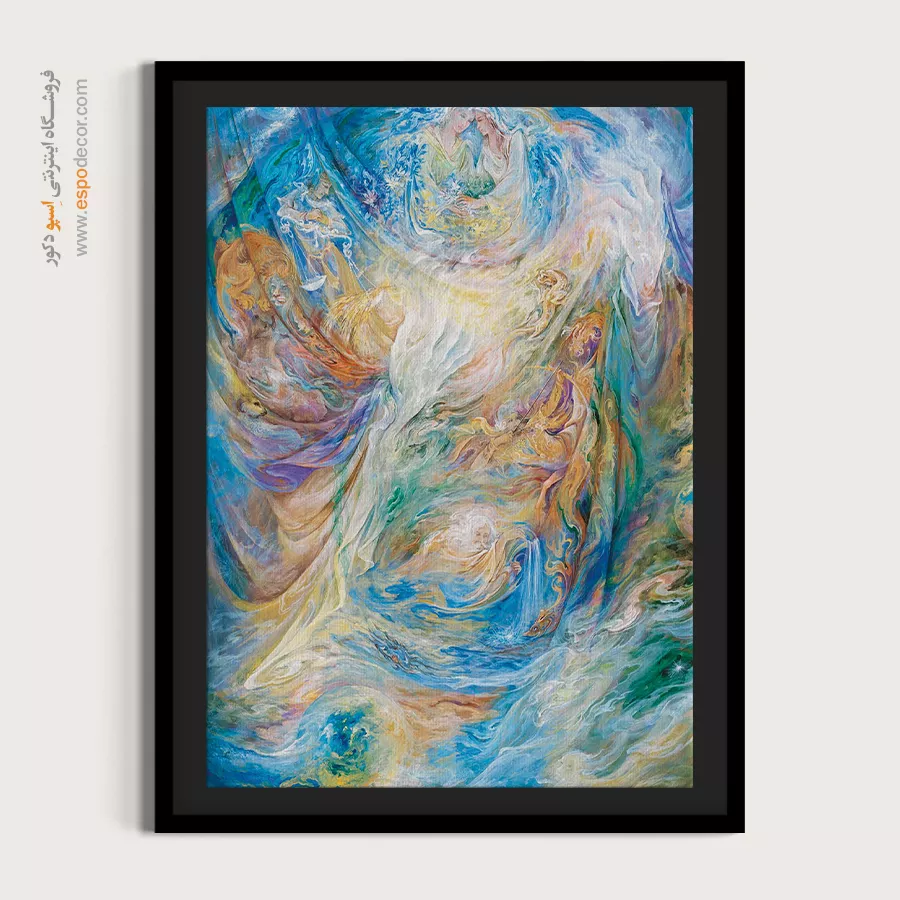 تابلو نقاشی «نشانه‌های زودیاک» که با نام‌های سنتی **«دایره البروج»** یا **«رقص کائنات»** نیز شناخته می‌شود، یکی از پرانرژی‌ترین و پیچیده‌ترین آثار استاد محمود فرشچیان است. این اثر فراتر از علم نجوم، ارتباط مرموز میان انسان، سرنوشت و چرخه‌ی ستارگان را به نمایش می‌گذارد. فرشتگانی که هر یک نماد یک ماه یا یک نشانه‌ی فلکی هستند، در یک گرداب رنگی با هم آمیخته‌اند. ما در اسپو دکور، این تابلوی کیهانی را با کیفیت چاپ موزه‌ای روی بوم کنواس آماده کرده‌ایم تا عظمت آسمان را به دکوراسیون شما بیاورد.