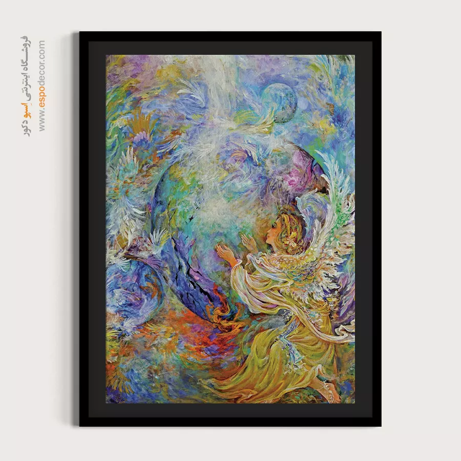 تابلو نقاشی «نیایش» که با نامهای **«راز و نیاز»** و **«بانوی آفرینش»** نیز شناخته میشود، یکی از پرانرژیترین و معنویترین آثار استاد محمود فرشچیان است. این اثر بیانگر پیوند عمیق میان عالم فرشتگان و جهان مادی است؛ جایی که موجودی نورانی با تمام وجود، برای سلامت و آرامش جهان (که در قالب یک گوی آسیبپذیر در مرکز تابلوست) دعا میکند. ما در اسپو دکور، این تابلوی کیهانی را با بالاترین کیفیت چاپ روی بوم کنواس آماده کردهایم تا انرژی مثبت و رنگهای زنده را به فضای شما بیاورد.تحلیل هنری و نمادشناسی اثر