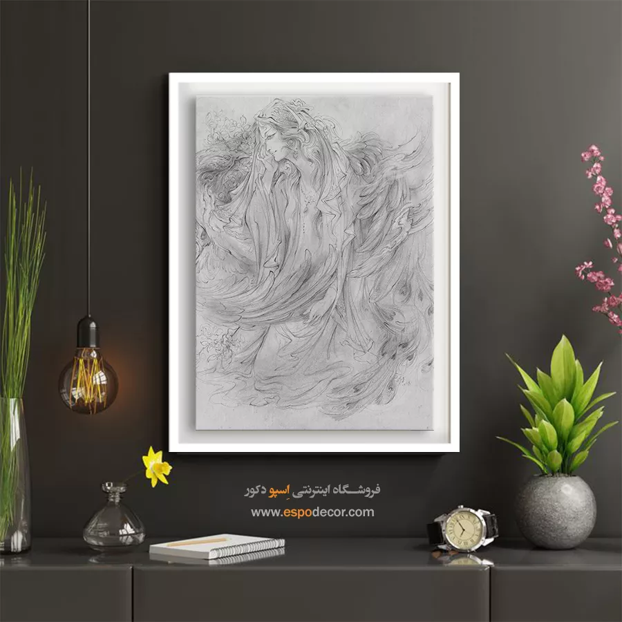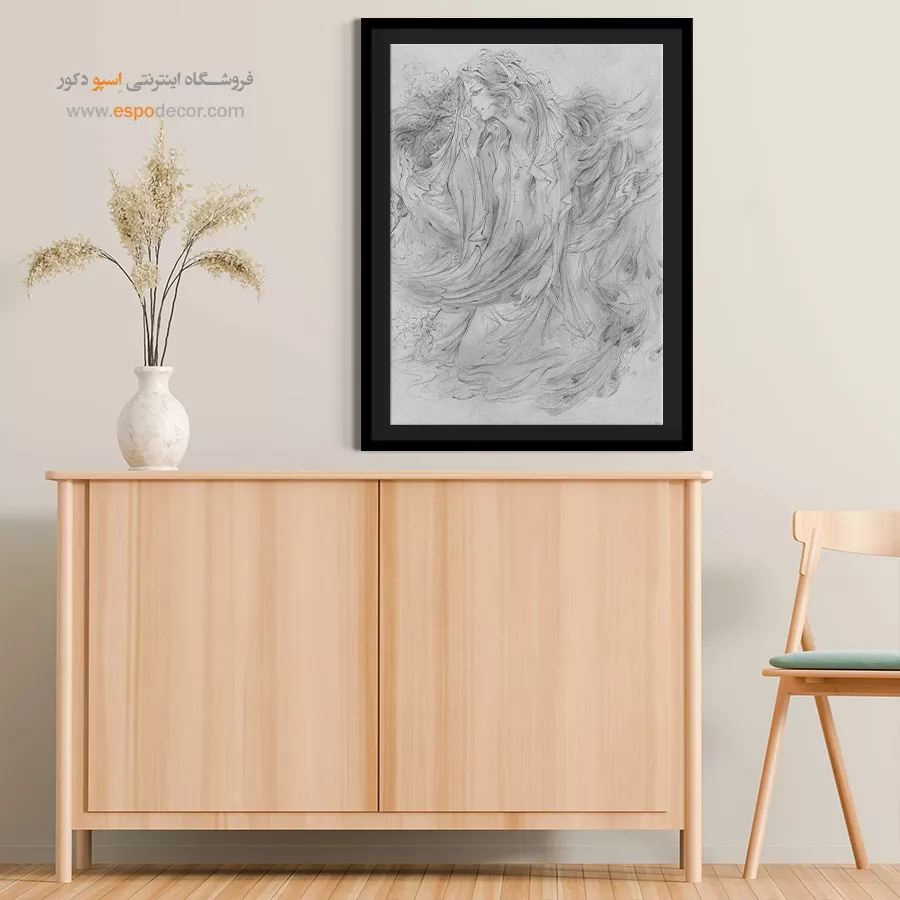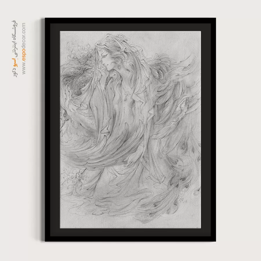 تابلو طراحی «مطالعه ۱» که در محافل هنری با عنوان **«طراحی سیاه قلم»** نیز شناخته میشود، نمایی از توانایی بینظیر استاد محمود فرشچیان در حوزه طراحی است. این اثر نشان میدهد که زیباییشناسی استاد فراتر از رنگهای پرشور است و در سادگی خط و سایه نیز به اوج خود میرسد. فیگور زنانه در این تابلو، با موها و لباسهایی مواج و سیال، حالتی از تفکر و لطافت را به نمایش گذاشته است. ما در اسپو دکور، این طراحی ارزشمند را با نهایت دقت در جزئیات خط و سایه، روی بوم کنواس چاپ کردهایم.تحلیل هنری و زیباییشناسی اثر