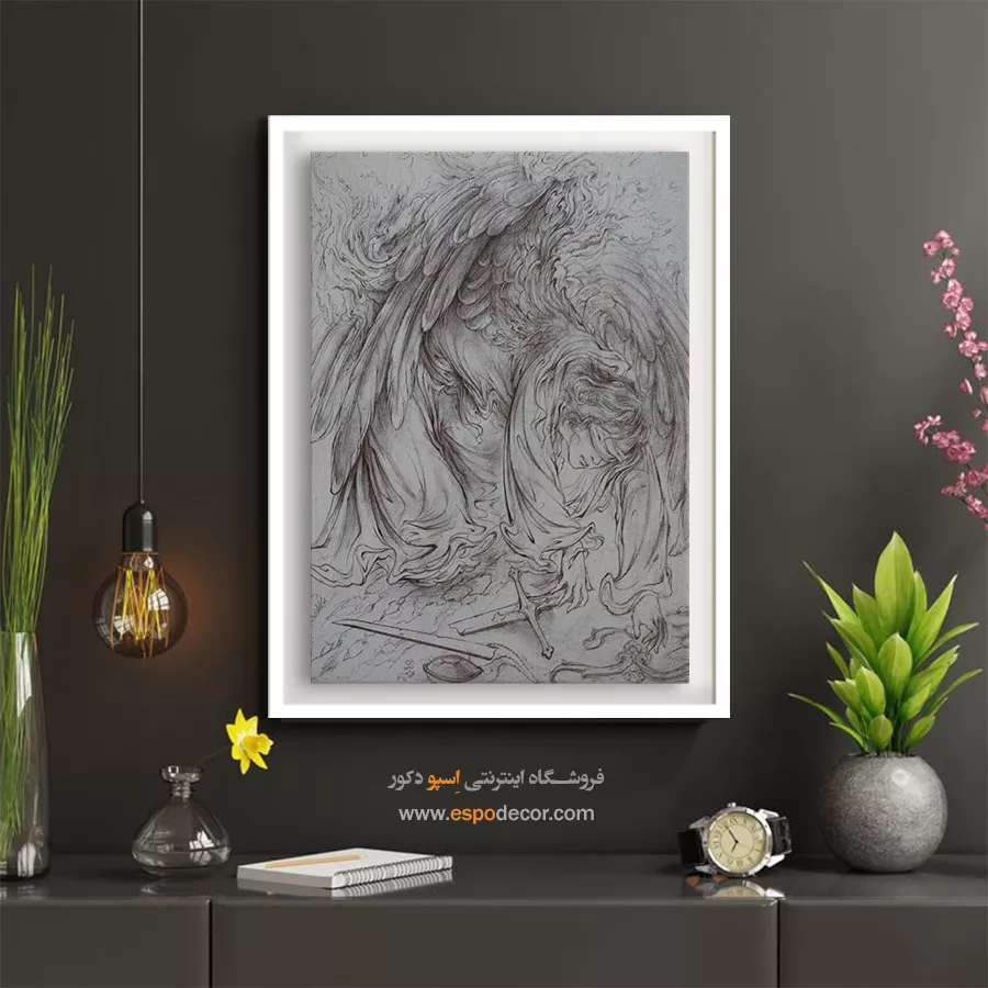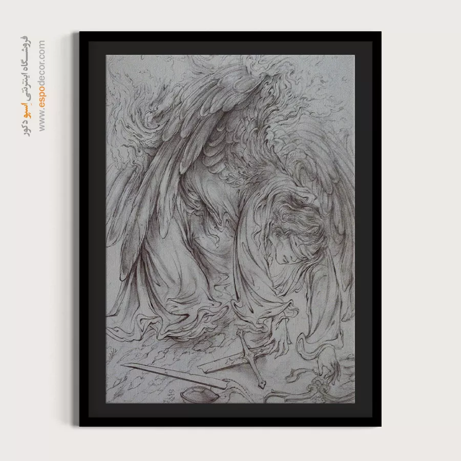 تابلو طراحی «مطالعه ۶» که با نامهای **«ندامت»**، **«صلح»** و **«تسلیم»** نیز شناخته میشود، یکی از روحانیترین آثار استاد محمود فرشچیان در سبک سیاه قلم است. این اثر نماد عالی «سجده» و تضرع است؛ فرشتهای که با تمام قدرت آسمانیاش، خشونت را کنار گذاشته و سر بر آستان حقیقت نهاده است. ما در اسپو دکور، این طراحی ارزشمند را با نهایت دقت در نمایش خطوط و بافت سایهها، روی بوم کنواس چاپ کردهایم تا پیام صلح و آرامش را به فضای شما بیاورد.تحلیل هنری و قدرت بصری اثر