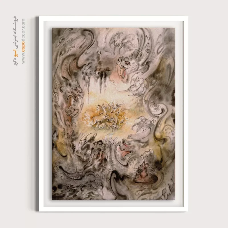 تابلو نقاشی «محاصره شده» که با نامهای **«آهوان در خطر»** و **«آسيب»** نیز شناخته میشود، یکی از پرهیجانترین و نمادینترین آثار استاد محمود فرشچیان در سبک آب مرکب است. این اثر هشداری بصری دربارهی خطراتی است که همواره در کمین پاکی و معصومیت (آهوان) هستند. در این تابلو، گروهی از غزالها در مرکز یک گرداب تاریک، در محاصرهی موجوداتی دیومانند قرار گرفتهاند. ما در اسپو دکور، این اثر دراماتیک را با حفظ تمام ظرافتهای سایه و روشنهای آب مرکب، روی بوم کنواس چاپ کردهایم.تحلیل هنری و نمادشناسی اثر