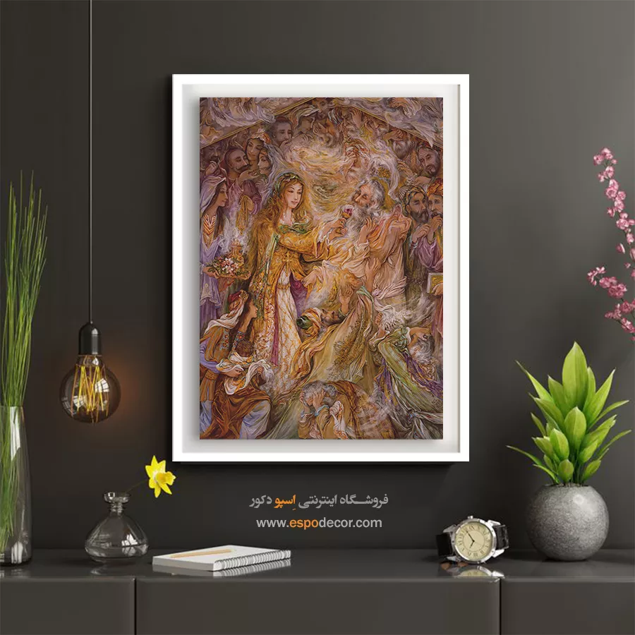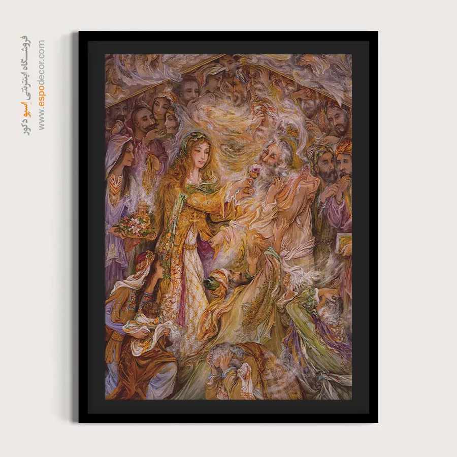 تابلو نقاشی «رنج سعادتمندانه» که با نام‌های **«باده وصال»** و **«خلسه»** نیز شناخته می‌شود، یکی از عاشقانه‌ترین آثار استاد محمود فرشچیان با ریشه‌های عمیق عرفانی است. این اثر بیانگر اعتقاد صوفیانه است که رنج در راه معشوق، عین سعادت و لذت است. لحظه‌ای که پیرِ سالک (عاشق) از دست ساقی (معشوق/مبدأ الهام) جام عشق را دریافت می‌کند و از شدت شور، مدهوش می‌شود. ما در اسپو دکور، این تابلوی روحانی و باشکوه را با بالاترین کیفیت چاپ روی بوم کنواس ارائه می‌دهیم.