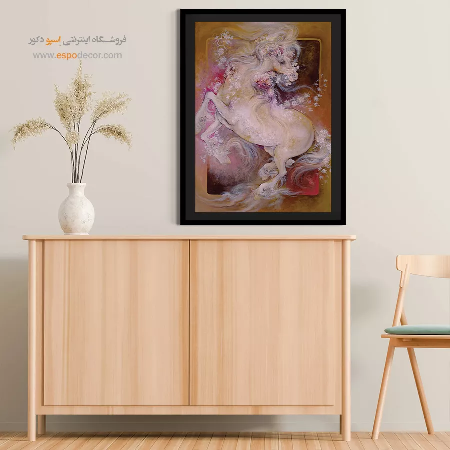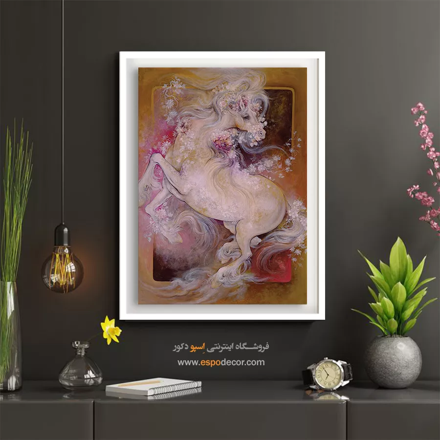 این اثر تصویر اسبی برازنده را نشان میدهد که با رنگهای ملایم و طبیعت اطراف، حس وقار و لطافت را القا میکند.