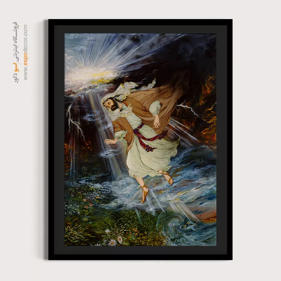 این تابلو داستان حضرت ابراهیم (ع) را به تصویر میکشد که آتش بر او گلستان شد؛ نمادی از ایمان و لطف الهی.