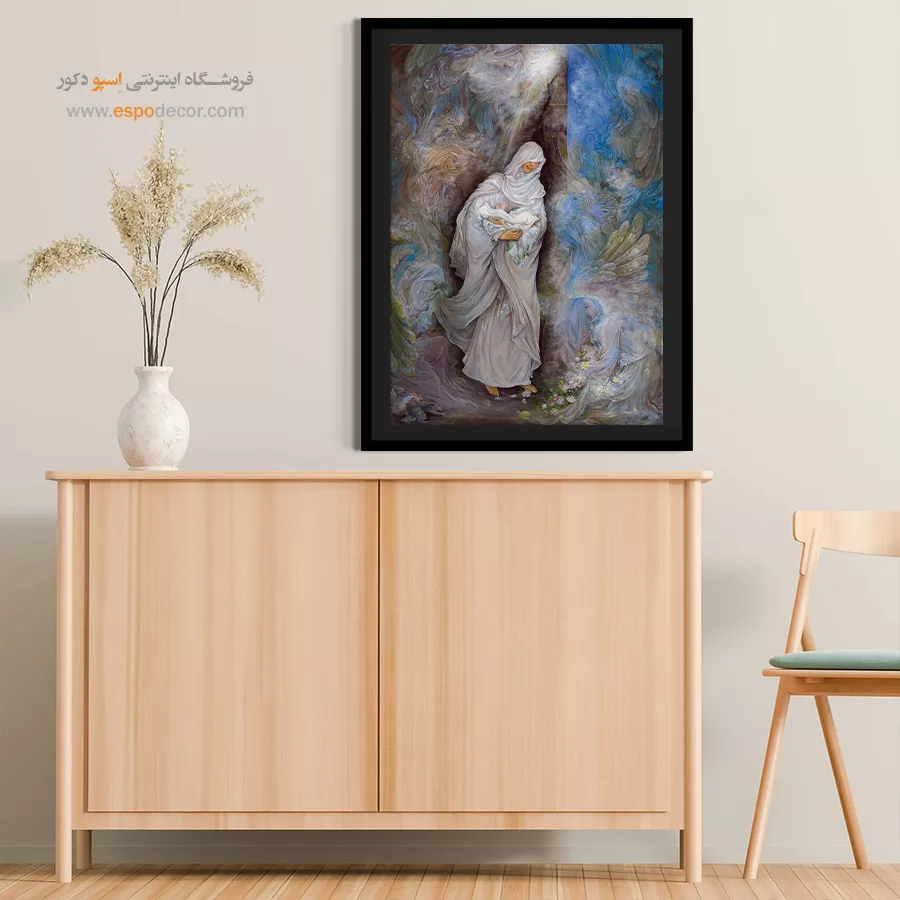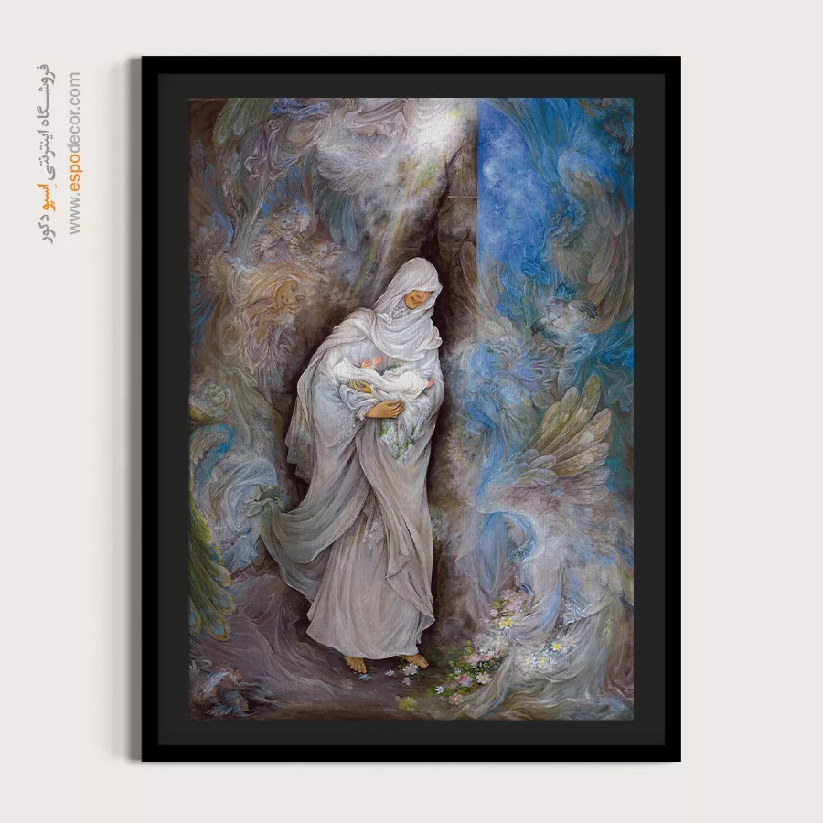 - رنگبندی باوقار: استفاده از رنگهای **قهوهای و خاکی** (برای کعبه) در کنار **سفید، طلایی و سبز** (برای نوزاد و فرشتگان)، تضاد میان «جسم» و «روح» یا «خاک» و «افلاک» را به زیبایی نشان میدهد.