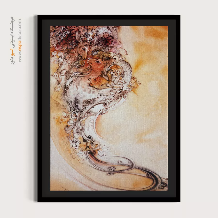 این تابلو تصویری از دو غزال (آهو) است که با خطوطی نرم و اسلیمی در هم تنیده شدهاند و نمادی از عشق، نجابت و زیبایی طبیعت هستند.رنگهای اصلی به کار رفته در این تابلو کدامند؟