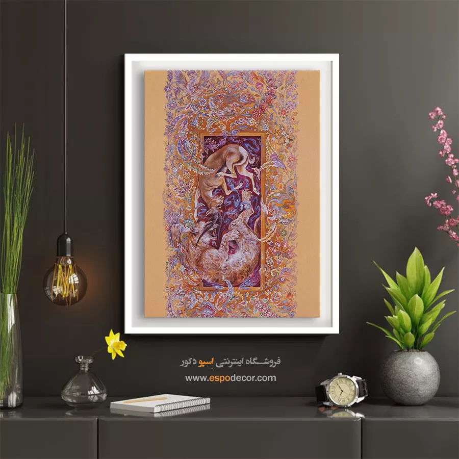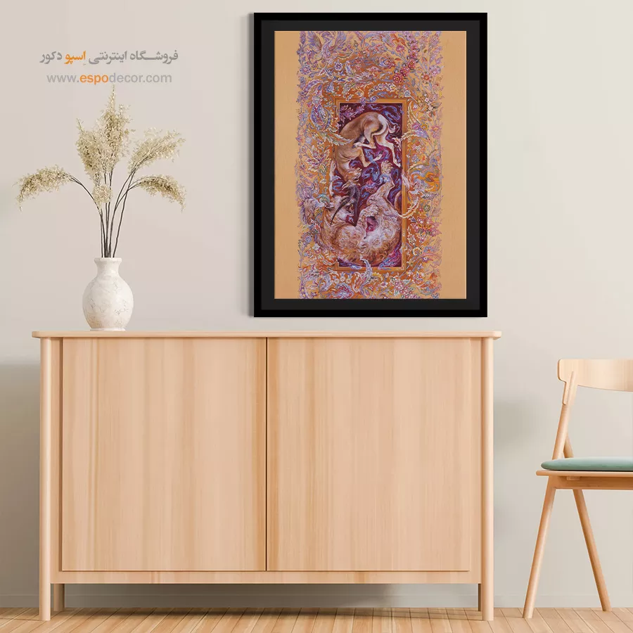 این تابلو به دلیل ماهیت کلاسیک و رنگهای گرمش، فضایی اشرافی و سنگین ایجاد میکند:- مکمل دکوراسیون سنتی و سلطنتی: به دلیل وجود حاشیههای تذهیبکاری شده، این اثر با دکوراسیونهای دارای فرش دستباف، مبلمان کلاسیک و پردههای مخمل، هماهنگی خیرهکنندهای دارد.